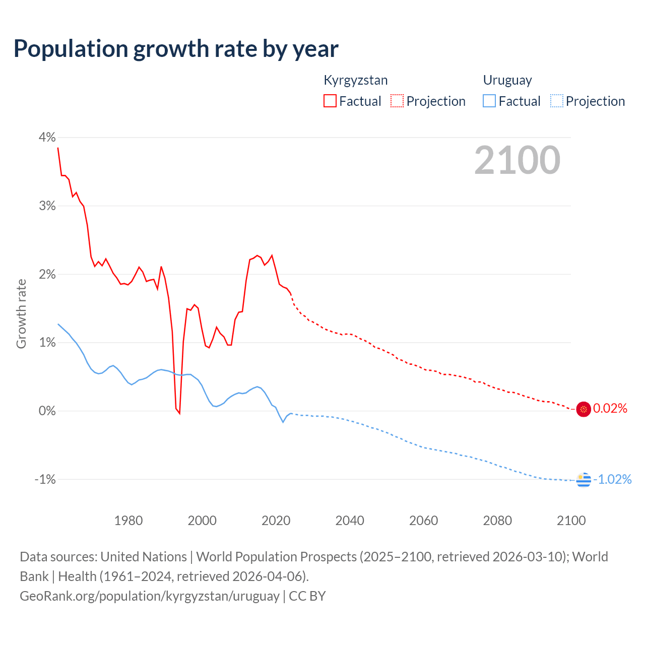 - For the last 10 years, Kyrgyzstan has had an average growth rate of +2.05% per year vs +0.11% in Uruguay.