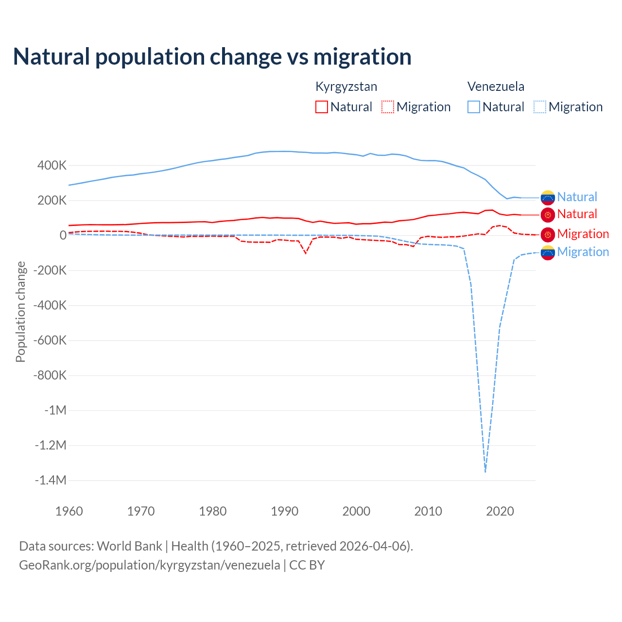 Over the last 10 years, 88.5% of the population change in Kyrgyzstan is from natural causes (a gain of 1,258,837 people) and 11.5% is from migration (a gain of 164,132 people). In Venezuela 38.6% is from natural causes (a gain of 2,946,257 people) and 61.4% is from migration (a loss of 4,683,227 people).