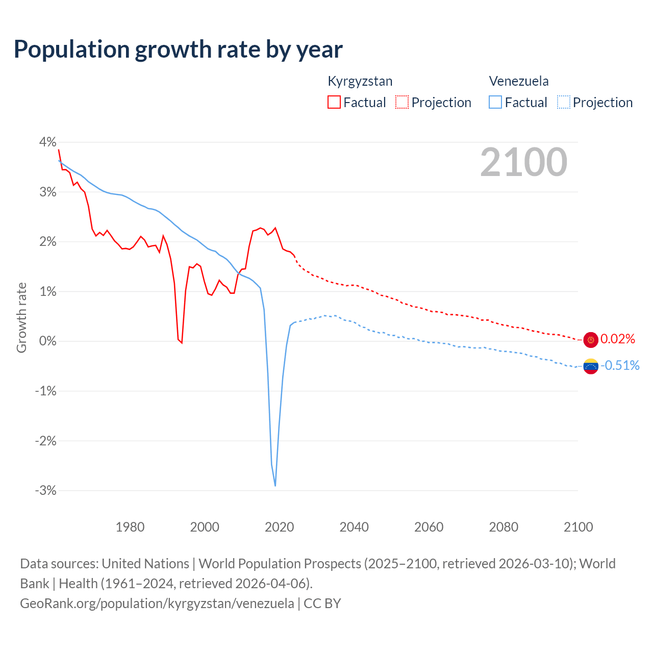 Data sources: World Bank | Health (1960–2024, retrieved 2026-04-06); United Nations | World Population Prospects (1960–2026, retrieved 2026-03-10); U.S. Census Bureau (1960–2025, retrieved 2026-02-08); Central Intelligence Agency (CIA) (2000–2019, retrieved 2026-02-20).
