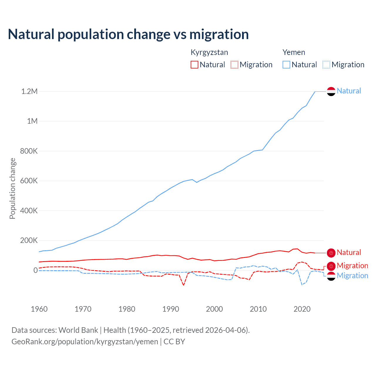 Over the last 10 years, 88.5% of the population change in Kyrgyzstan is from natural causes (a gain of 1,258,837 people) and 11.5% is from migration (a gain of 164,132 people). In Yemen 97.8% is from natural causes (a gain of 10,460,813 people) and 2.17% is from migration (a loss of 231,814 people).
