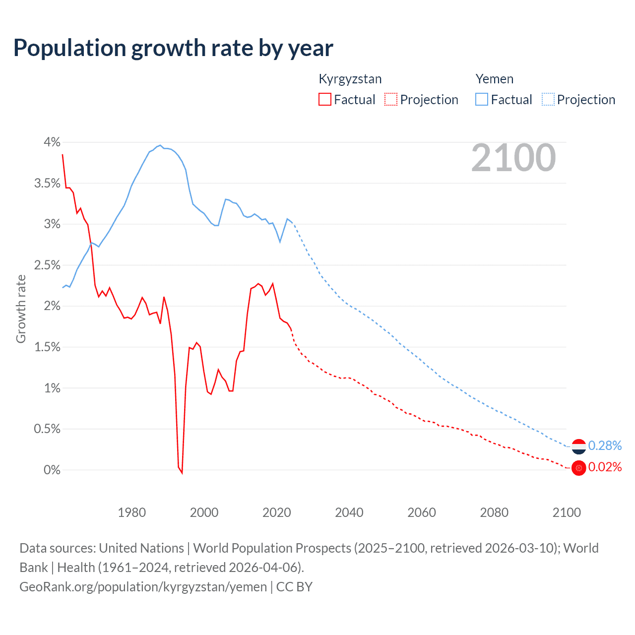 - For the last 10 years, Kyrgyzstan has had an average growth rate of +2.05% per year vs +3% in Yemen.