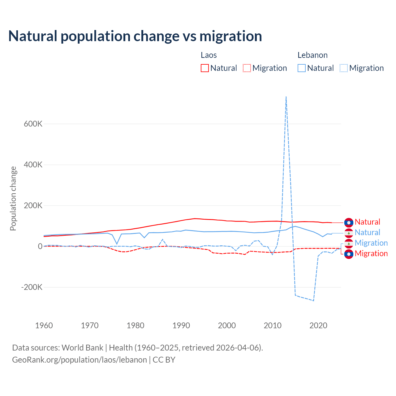 Over the last 10 years, 90.6% of the population change in Laos is from natural causes (a gain of 1,183,013 people) and 9.41% is from migration (a loss of 122,899 people). In Lebanon 40.1% is from natural causes (a gain of 739,256 people) and 59.9% is from migration (a loss of 1,103,772 people).