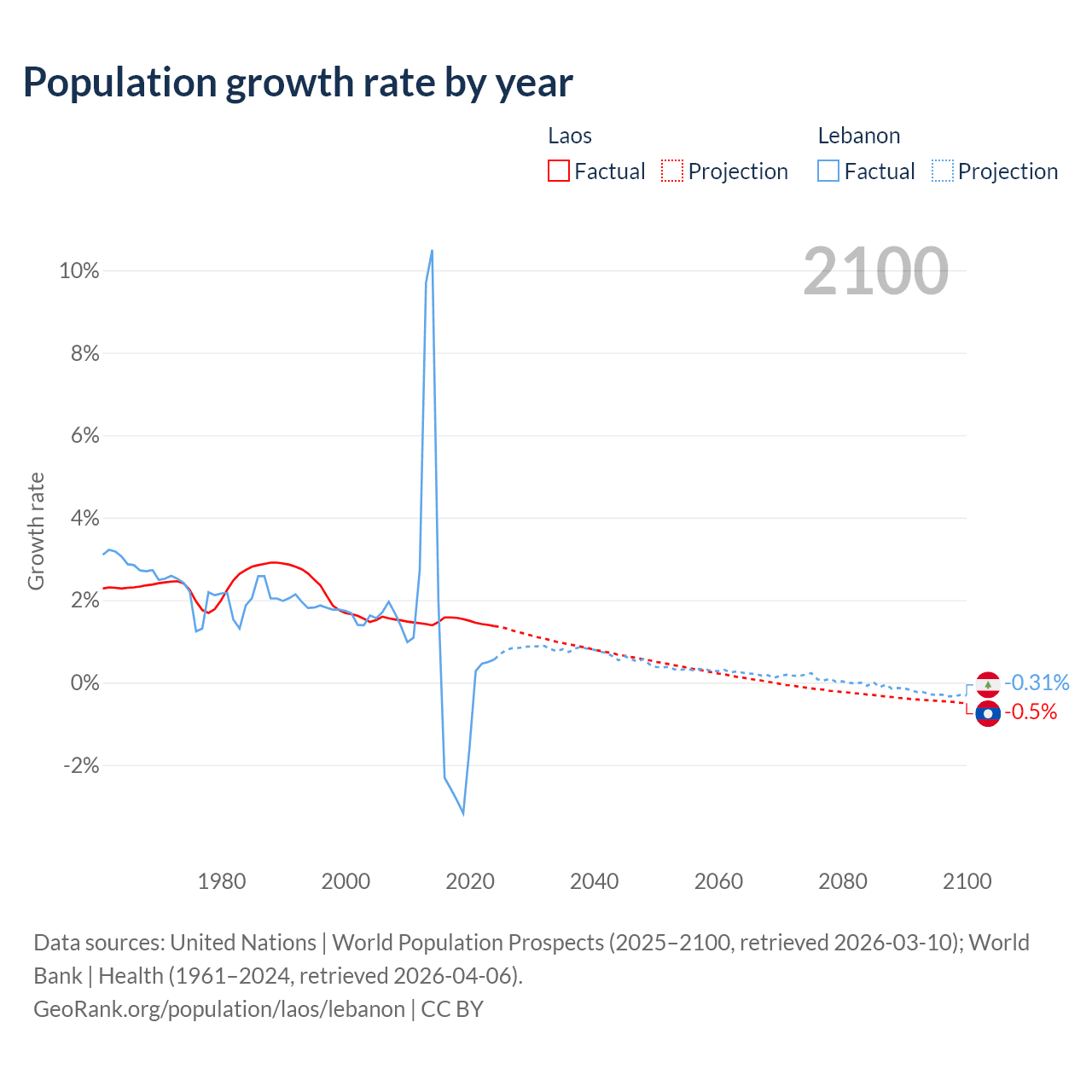 - For the last 10 years, Laos has had an average growth rate of +1.48% per year vs +0.16% in Lebanon.