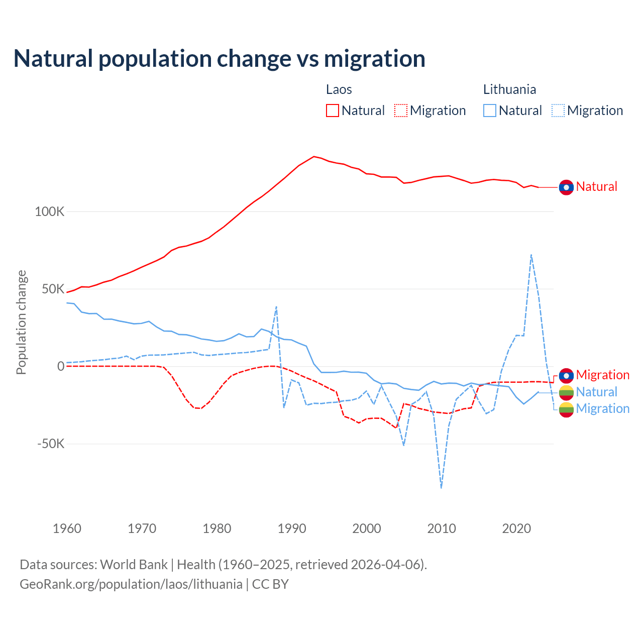 Over the last 10 years, 90.6% of the population change in Laos is from natural causes (a gain of 1,183,013 people) and 9.41% is from migration (a loss of 122,899 people). In Lithuania 68.7% is from natural causes (a loss of 153,859 people) and 31.3% is from migration (a gain of 70,196 people).