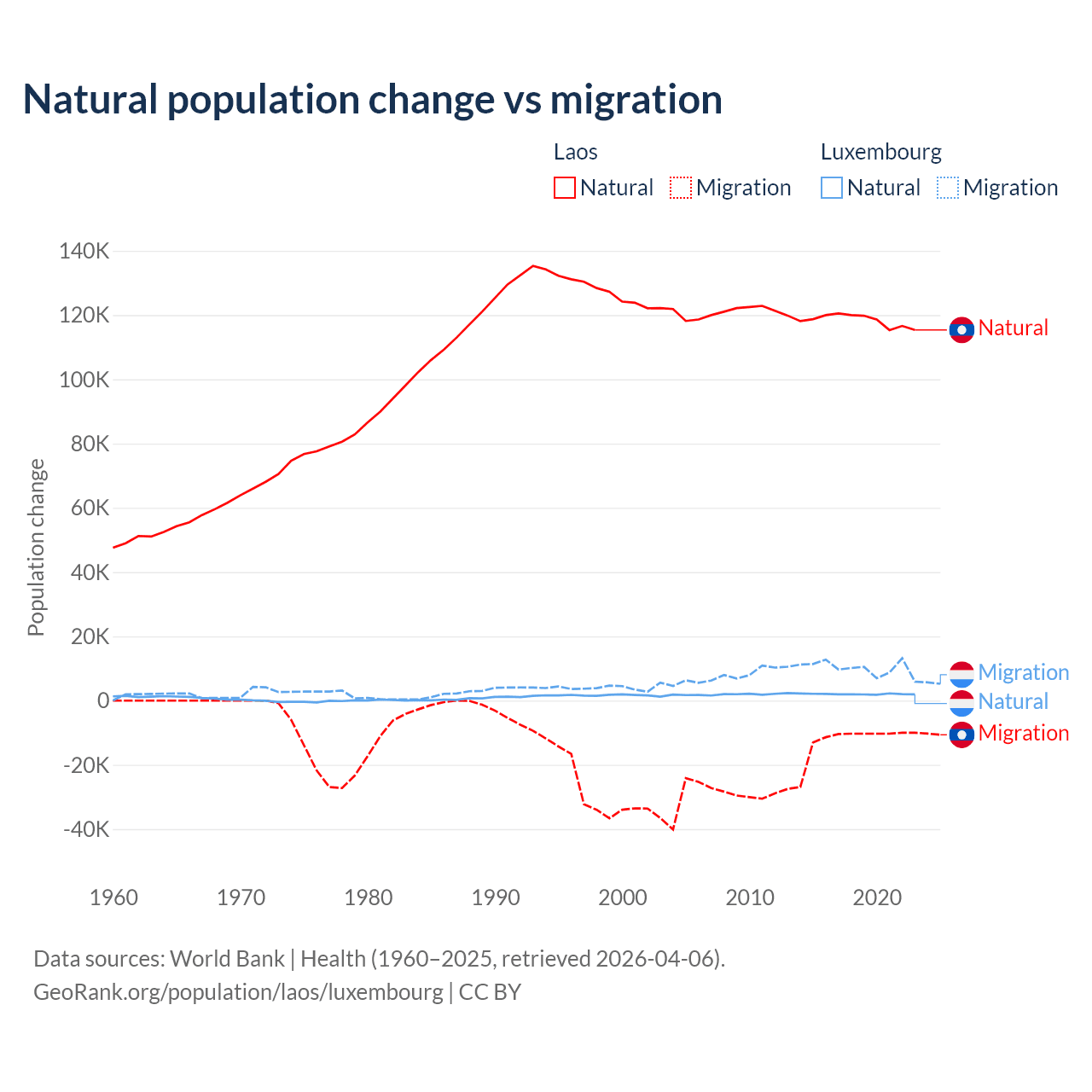 Over the last 10 years, 90.6% of the population change in Laos is from natural causes (a gain of 1,183,013 people) and 9.41% is from migration (a loss of 122,899 people). In Luxembourg 16.8% is from natural causes (a gain of 20,287 people) and 83.2% is from migration (a gain of 100,435 people).