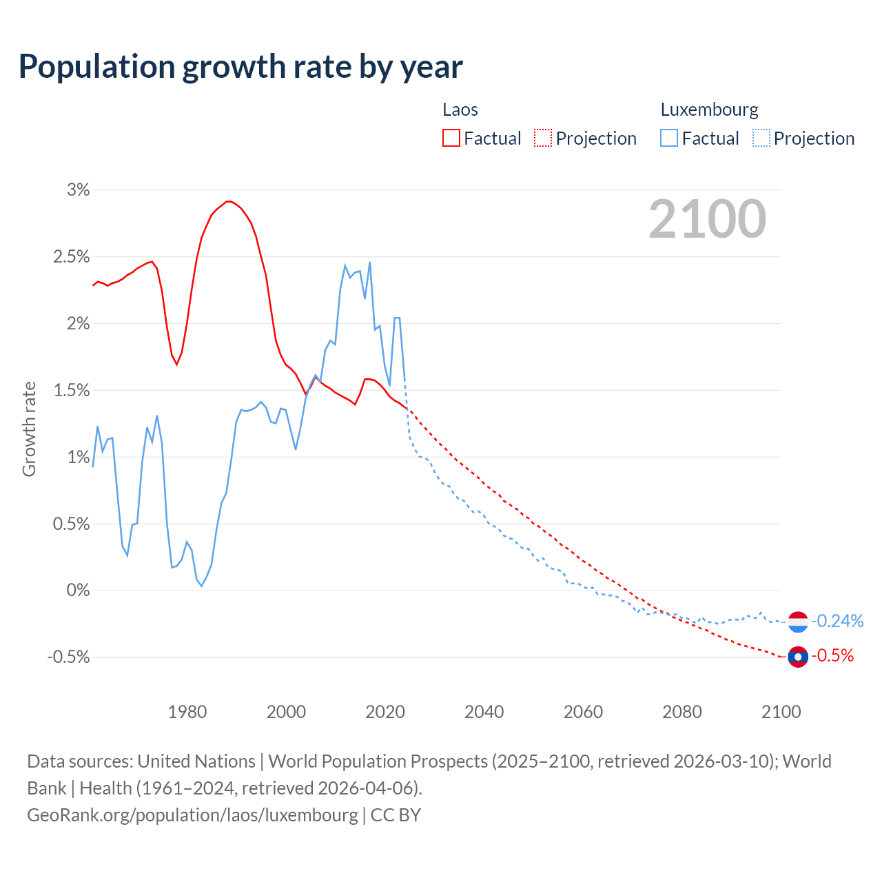 - For the last 10 years, Laos has had an average growth rate of +1.48% per year vs +2.02% in Luxembourg.