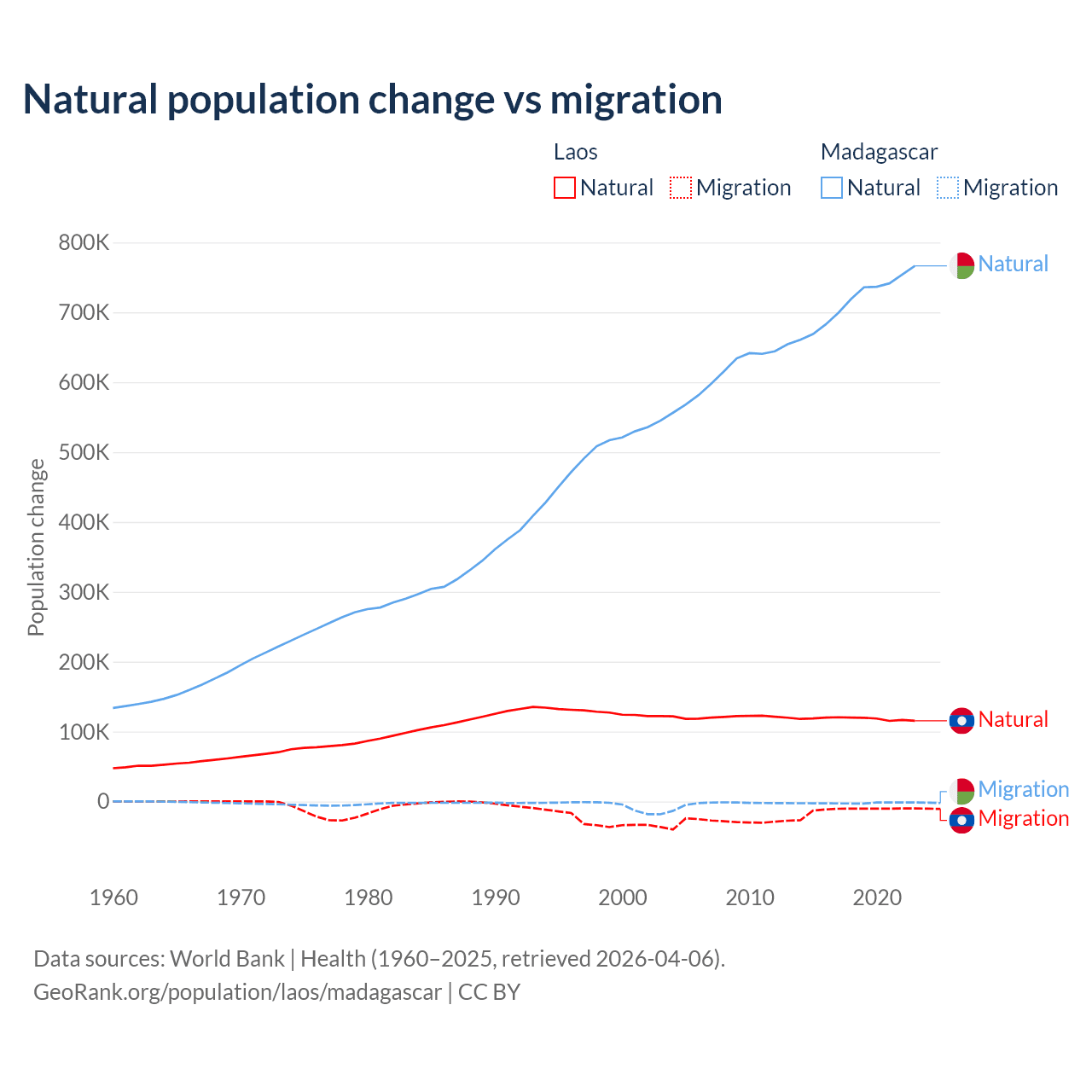 Over the last 10 years, 90.6% of the population change in Laos is from natural causes (a gain of 1,183,013 people) and 9.41% is from migration (a loss of 122,899 people). In Madagascar 99.7% is from natural causes (a gain of 7,165,578 people) and 0.31% is from migration (a loss of 22,384 people).