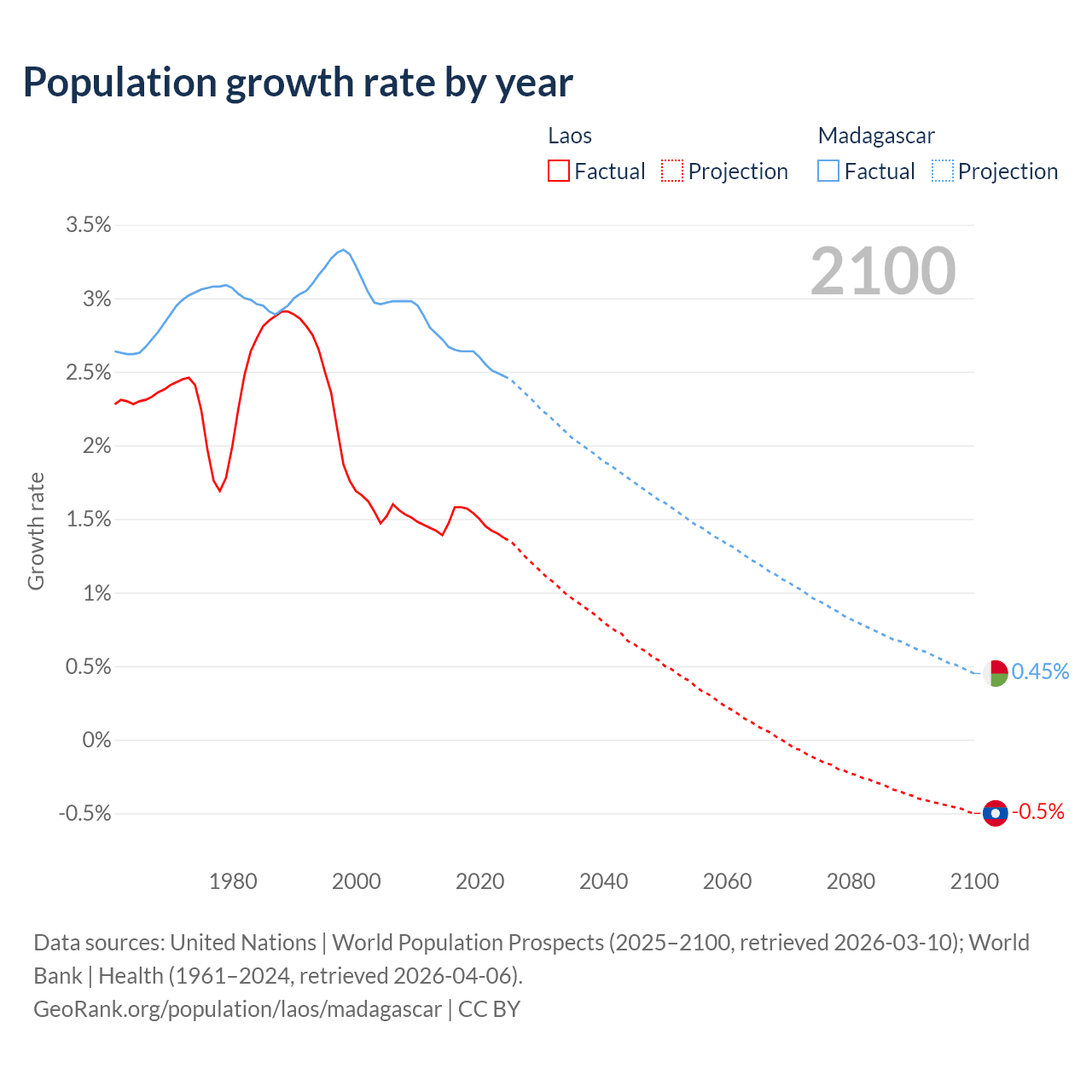 - For the last 10 years, Laos has had an average growth rate of +1.48% per year vs +2.6% in Madagascar.
