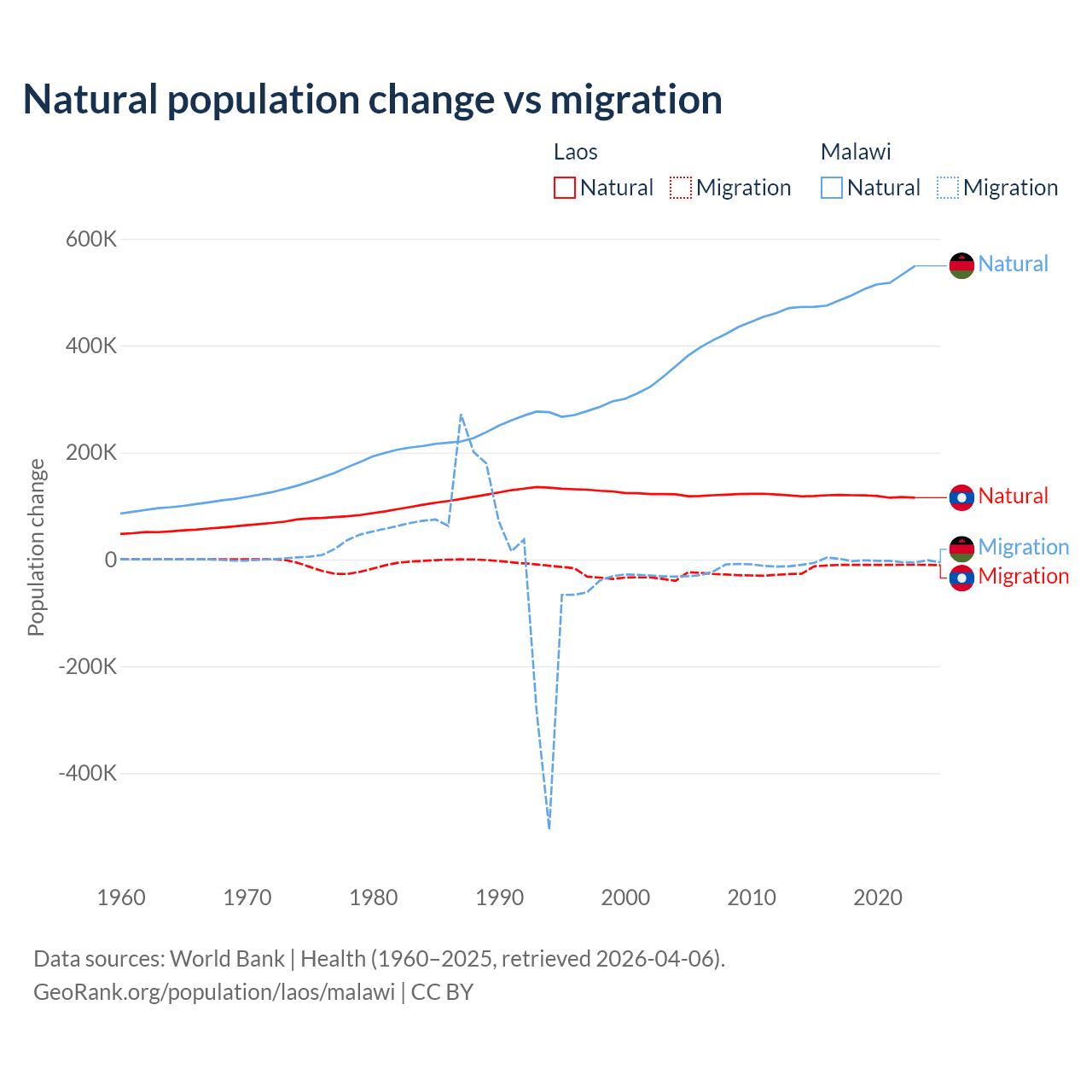 Over the last 10 years, 90.6% of the population change in Laos is from natural causes (a gain of 1,183,013 people) and 9.41% is from migration (a loss of 122,899 people). In Malawi 99.3% is from natural causes (a gain of 5,019,393 people) and 0.67% is from migration (a loss of 33,768 people).