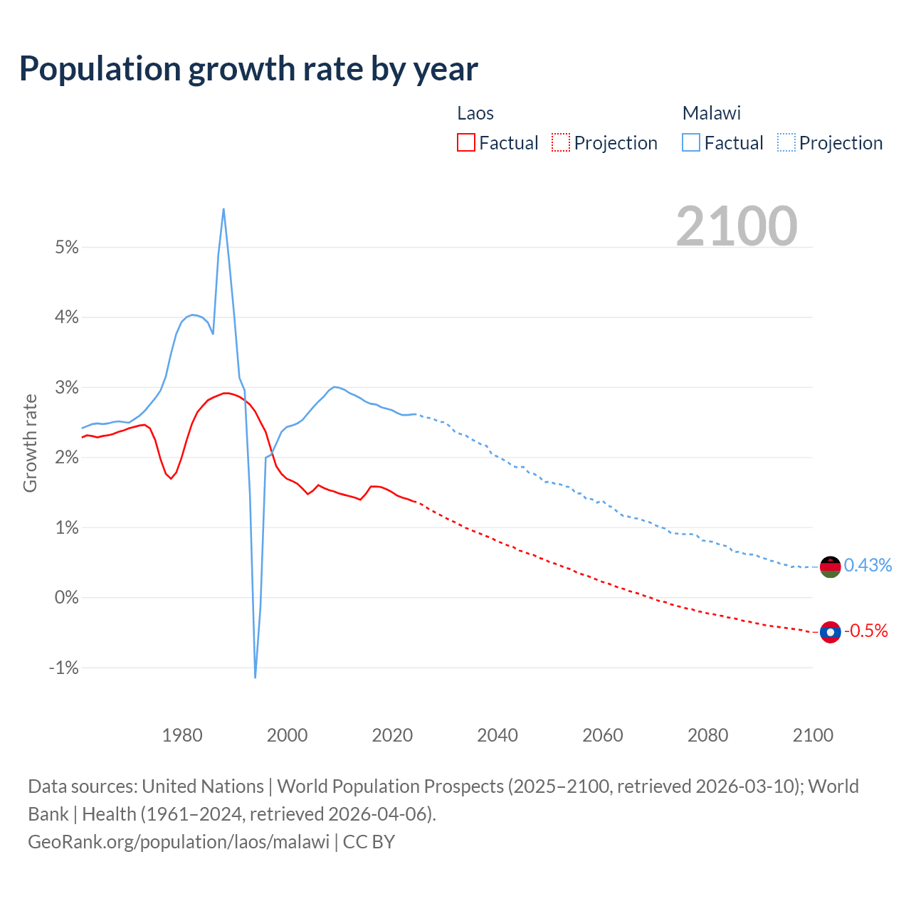 - For the last 10 years, Laos has had an average growth rate of +1.48% per year vs +2.7% in Malawi.