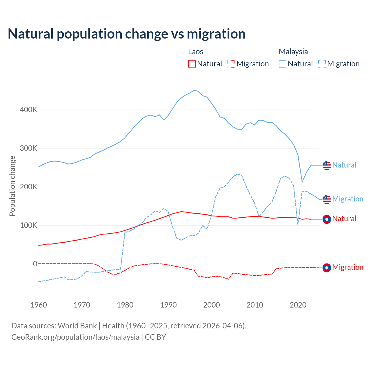 Over the last 10 years, 90.6% of the population change in Laos is from natural causes (a gain of 1,183,013 people) and 9.41% is from migration (a loss of 122,899 people). In Malaysia 61.7% is from natural causes (a gain of 3,029,648 people) and 38.3% is from migration (a gain of 1,882,159 people).