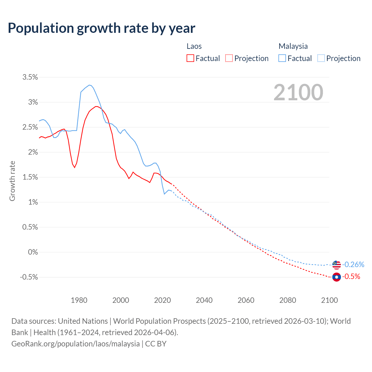 - For the last 10 years, Laos has had an average growth rate of +1.48% per year vs +1.5% in Malaysia.