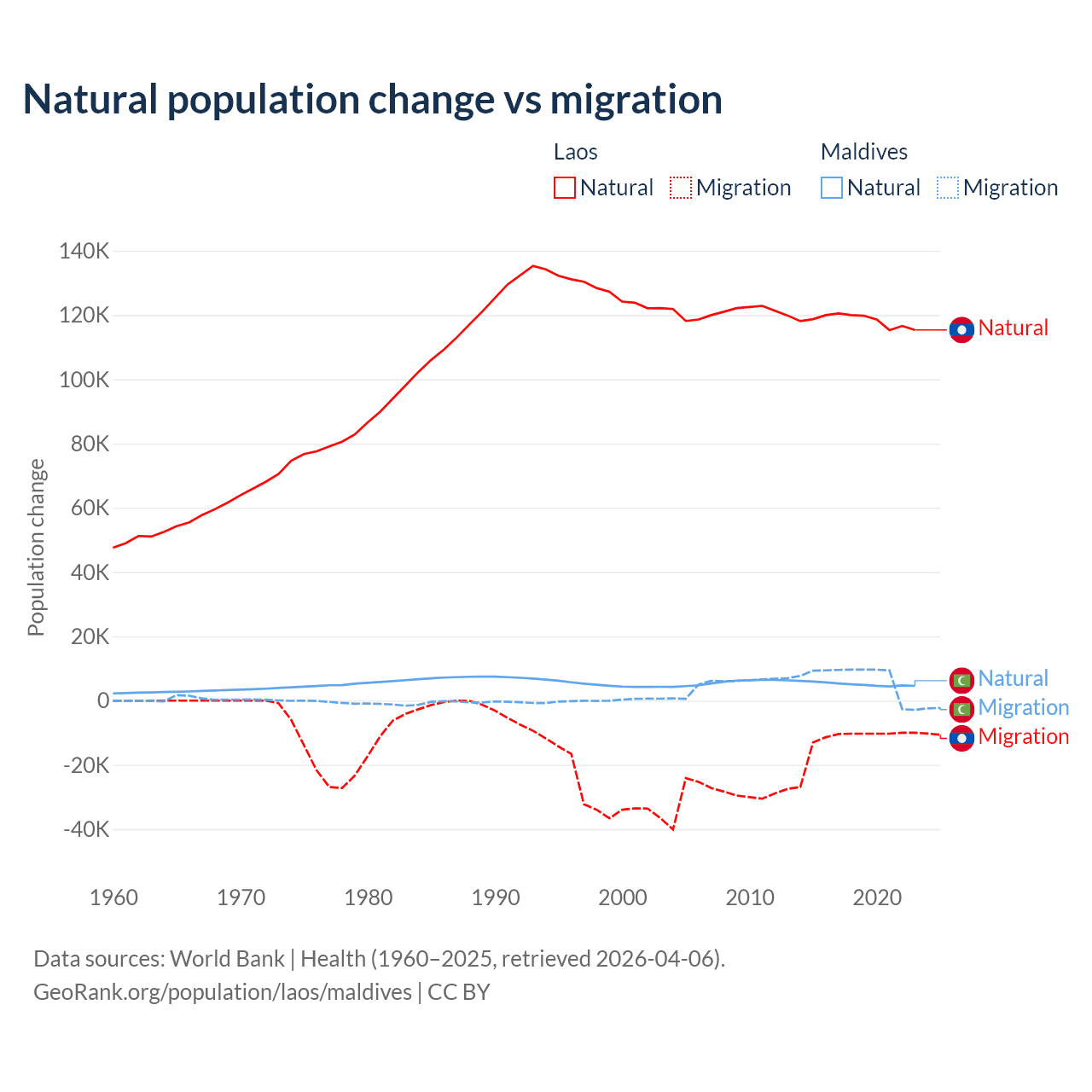 Over the last 10 years, 90.6% of the population change in Laos is from natural causes (a gain of 1,183,013 people) and 9.41% is from migration (a loss of 122,899 people). In Maldives 42.7% is from natural causes (a gain of 51,342 people) and 57.3% is from migration (a gain of 68,788 people).