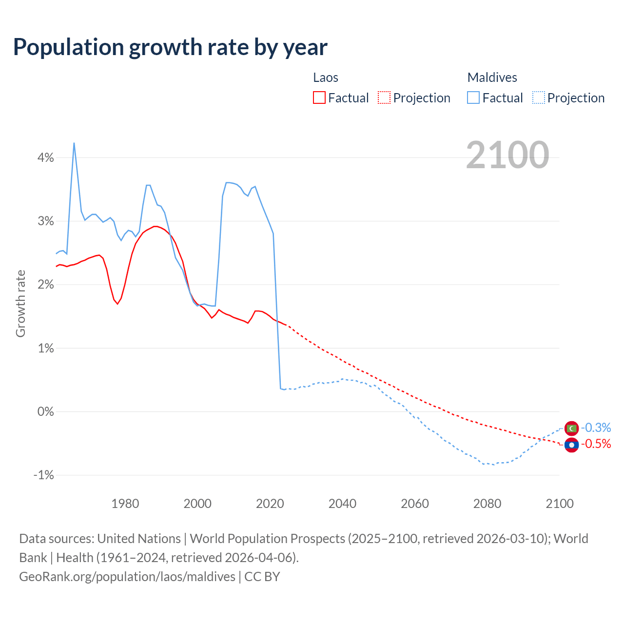 - For the last 10 years, Laos has had an average growth rate of +1.48% per year vs +2.56% in Maldives.