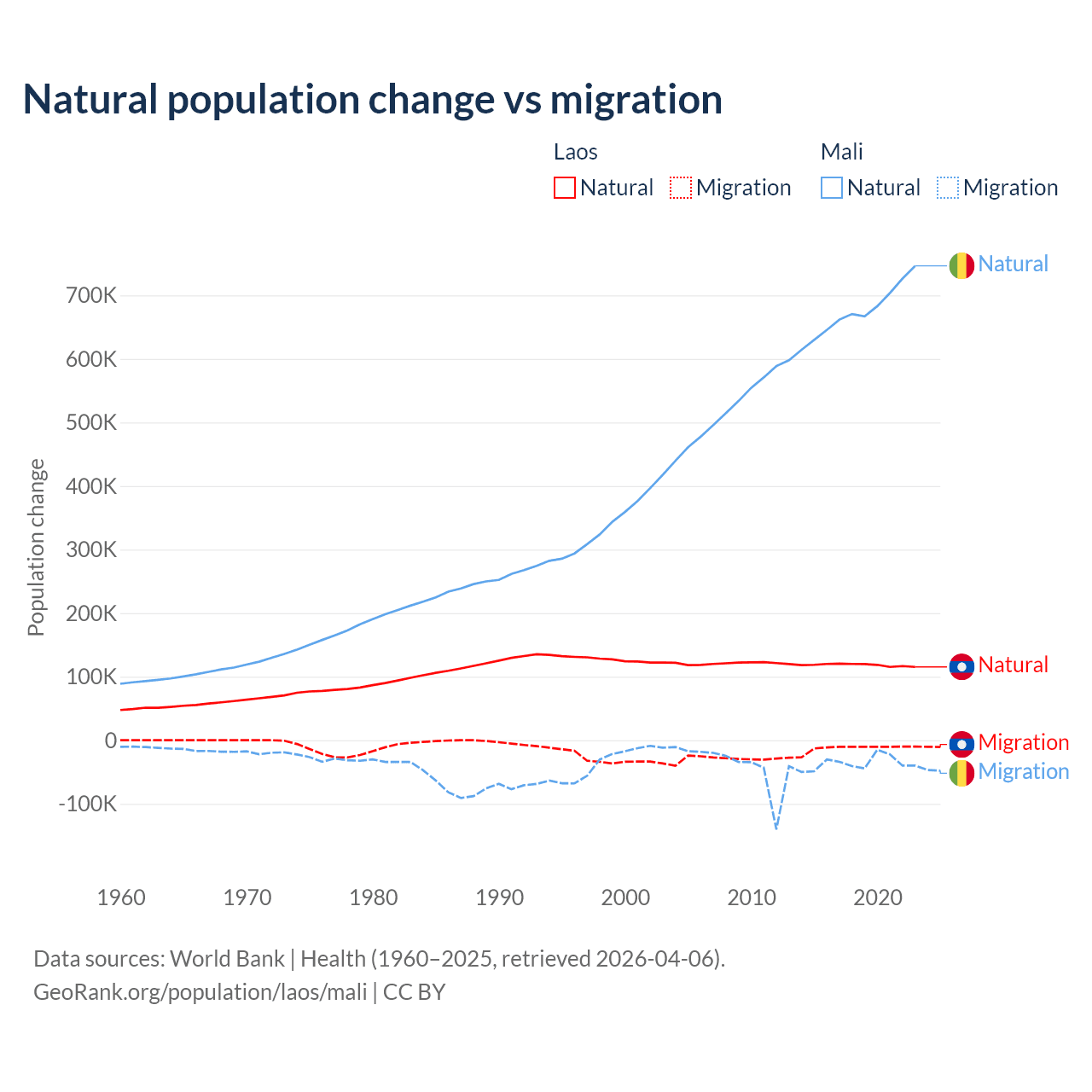 Over the last 10 years, 90.6% of the population change in Laos is from natural causes (a gain of 1,183,013 people) and 9.41% is from migration (a loss of 122,899 people). In Mali 94.9% is from natural causes (a gain of 6,749,473 people) and 5.13% is from migration (a loss of 365,292 people).