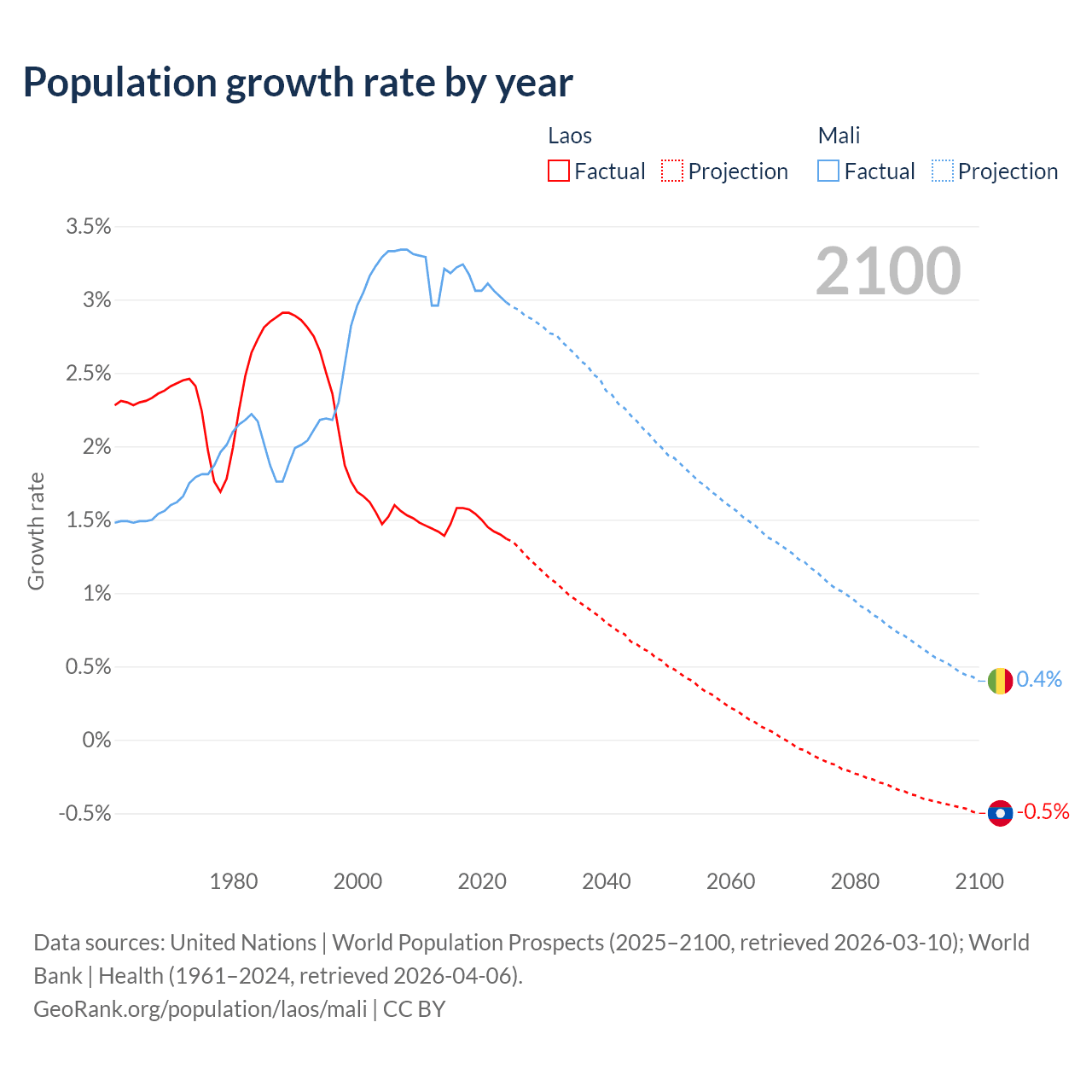 - For the last 10 years, Laos has had an average growth rate of +1.48% per year vs +3.12% in Mali.
