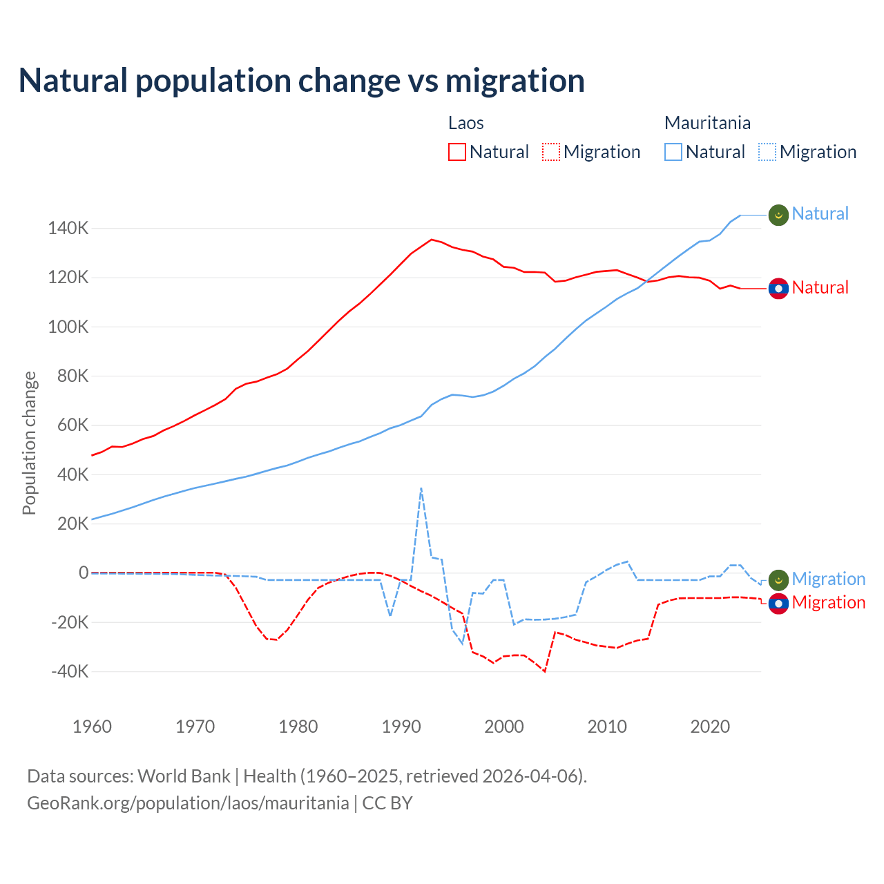 Over the last 10 years, 90.6% of the population change in Laos is from natural causes (a gain of 1,183,013 people) and 9.41% is from migration (a loss of 122,899 people). In Mauritania 98.9% is from natural causes (a gain of 1,320,903 people) and 1.12% is from migration (a loss of 14,982 people).
