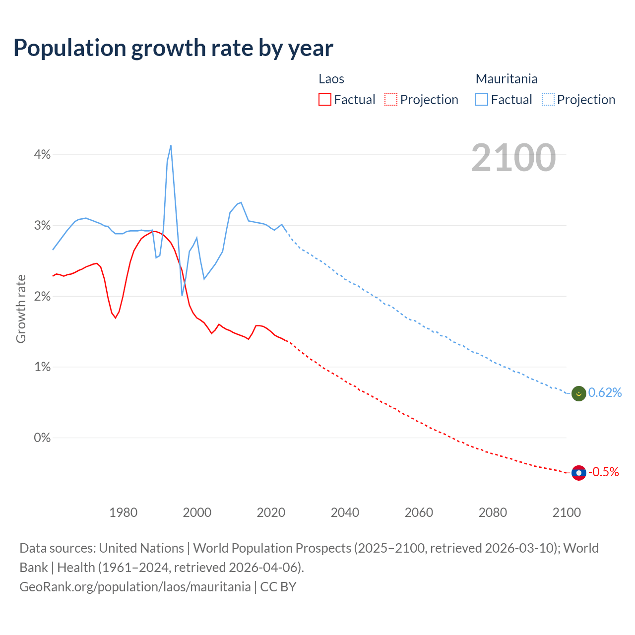 - For the last 10 years, Laos has had an average growth rate of +1.48% per year vs +3% in Mauritania.