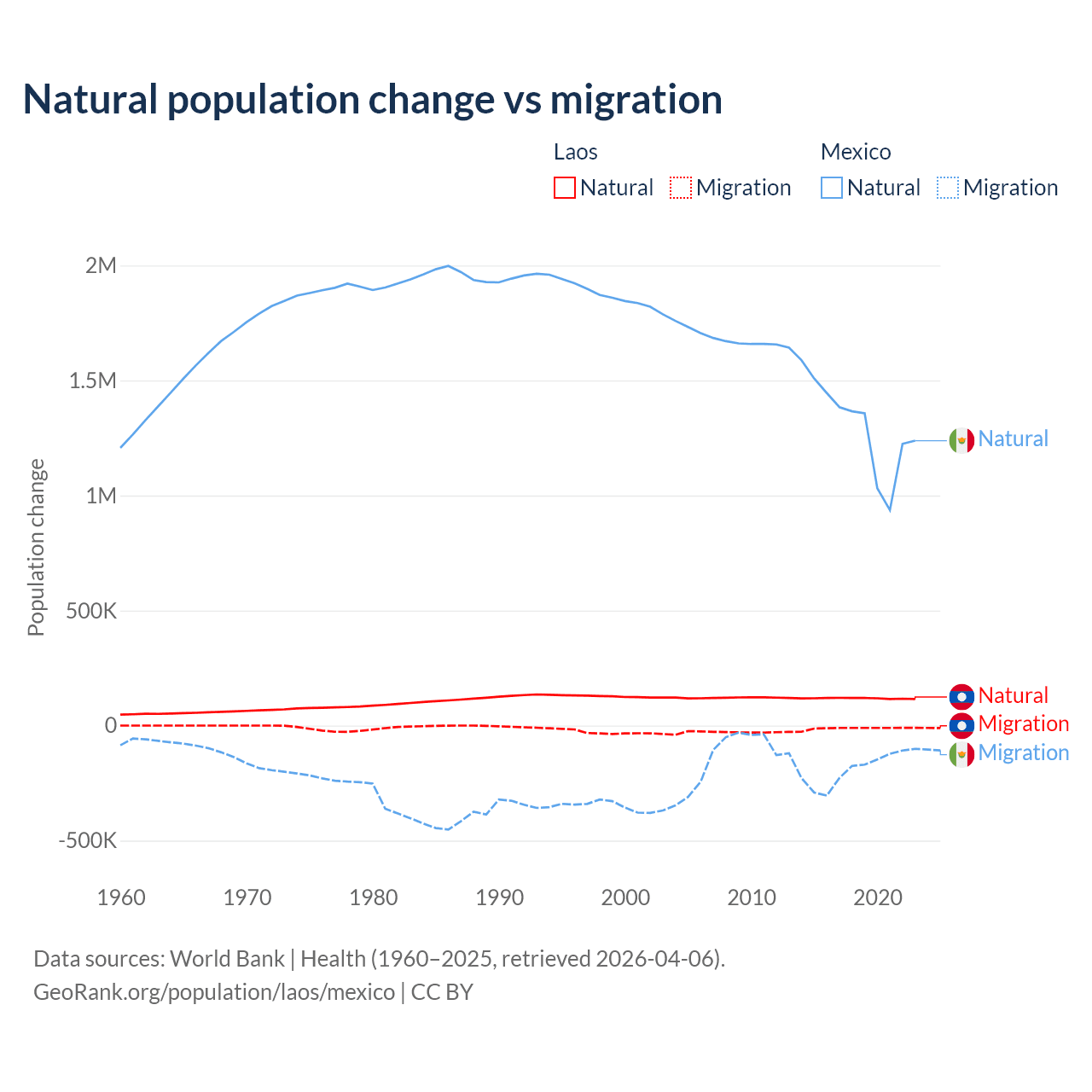 Over the last 10 years, 90.6% of the population change in Laos is from natural causes (a gain of 1,183,013 people) and 9.41% is from migration (a loss of 122,899 people). In Mexico 87.5% is from natural causes (a gain of 13,080,136 people) and 12.5% is from migration (a loss of 1,876,544 people).