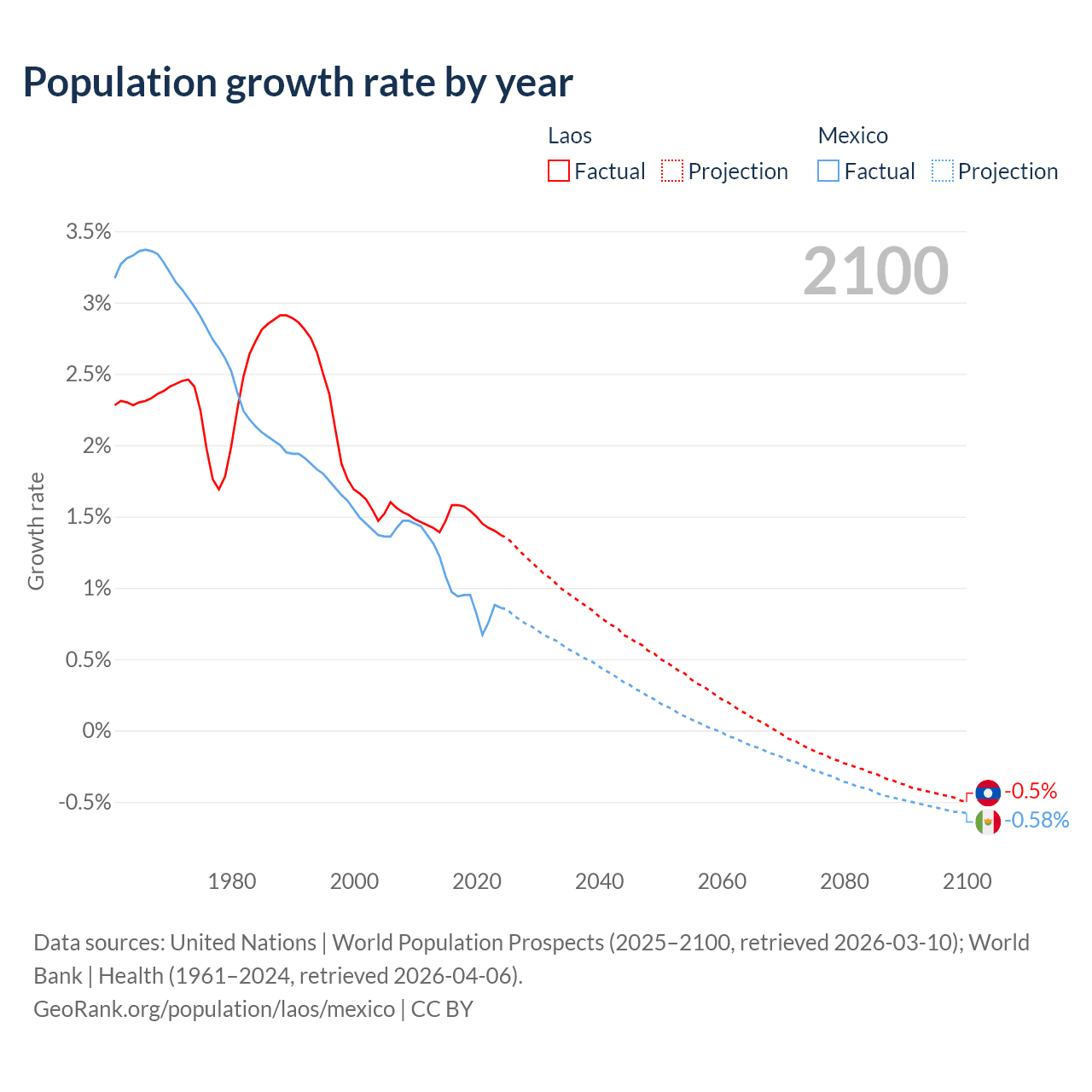 - For the last 10 years, Laos has had an average growth rate of +1.48% per year vs +0.92% in Mexico.