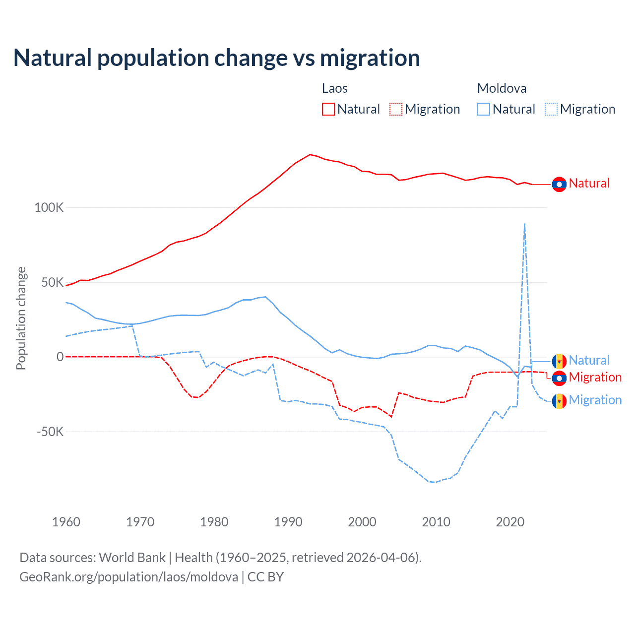 Over the last 10 years, 90.6% of the population change in Laos is from natural causes (a gain of 1,183,013 people) and 9.41% is from migration (a loss of 122,899 people). In Moldova 6.04% is from natural causes (a loss of 19,001 people) and 94% is from migration (a loss of 295,631 people).