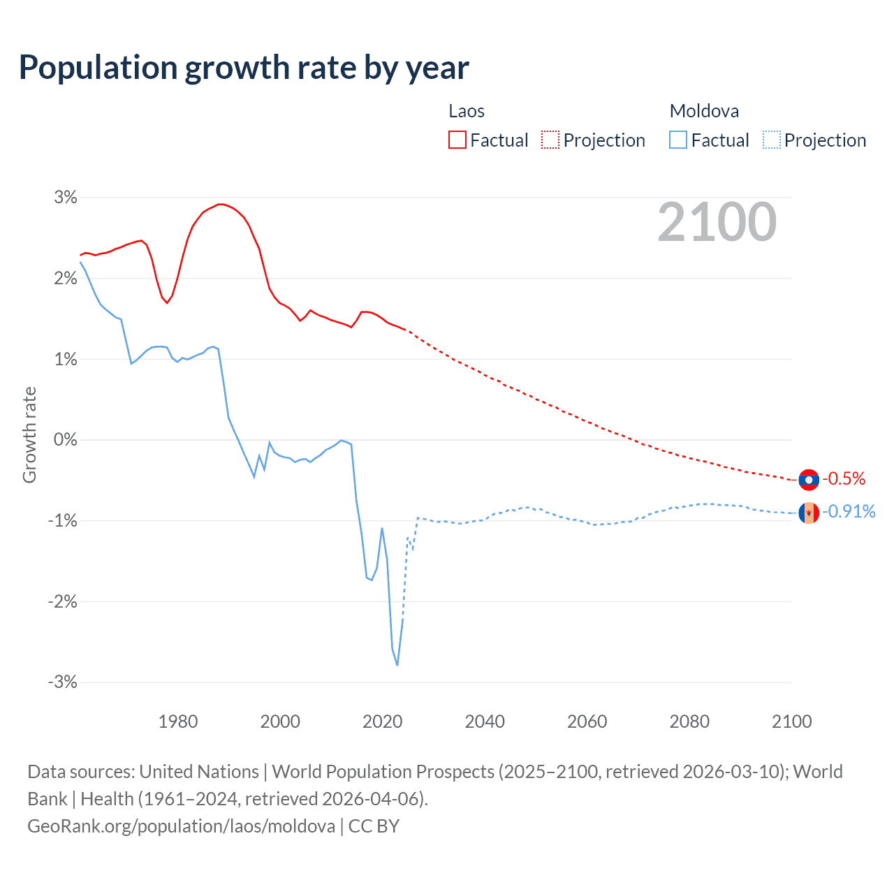 - For the last 10 years, Laos has had an average growth rate of +1.48% per year vs -1.57% in Moldova.
