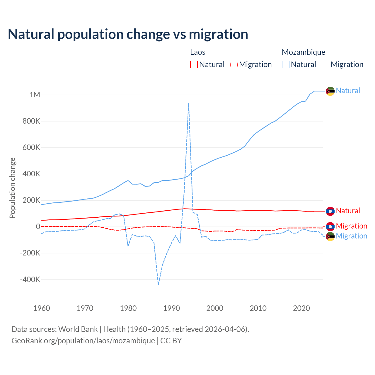 Over the last 10 years, 90.6% of the population change in Laos is from natural causes (a gain of 1,183,013 people) and 9.41% is from migration (a loss of 122,899 people). In Mozambique 95.9% is from natural causes (a gain of 9,108,203 people) and 4.15% is from migration (a loss of 393,923 people).