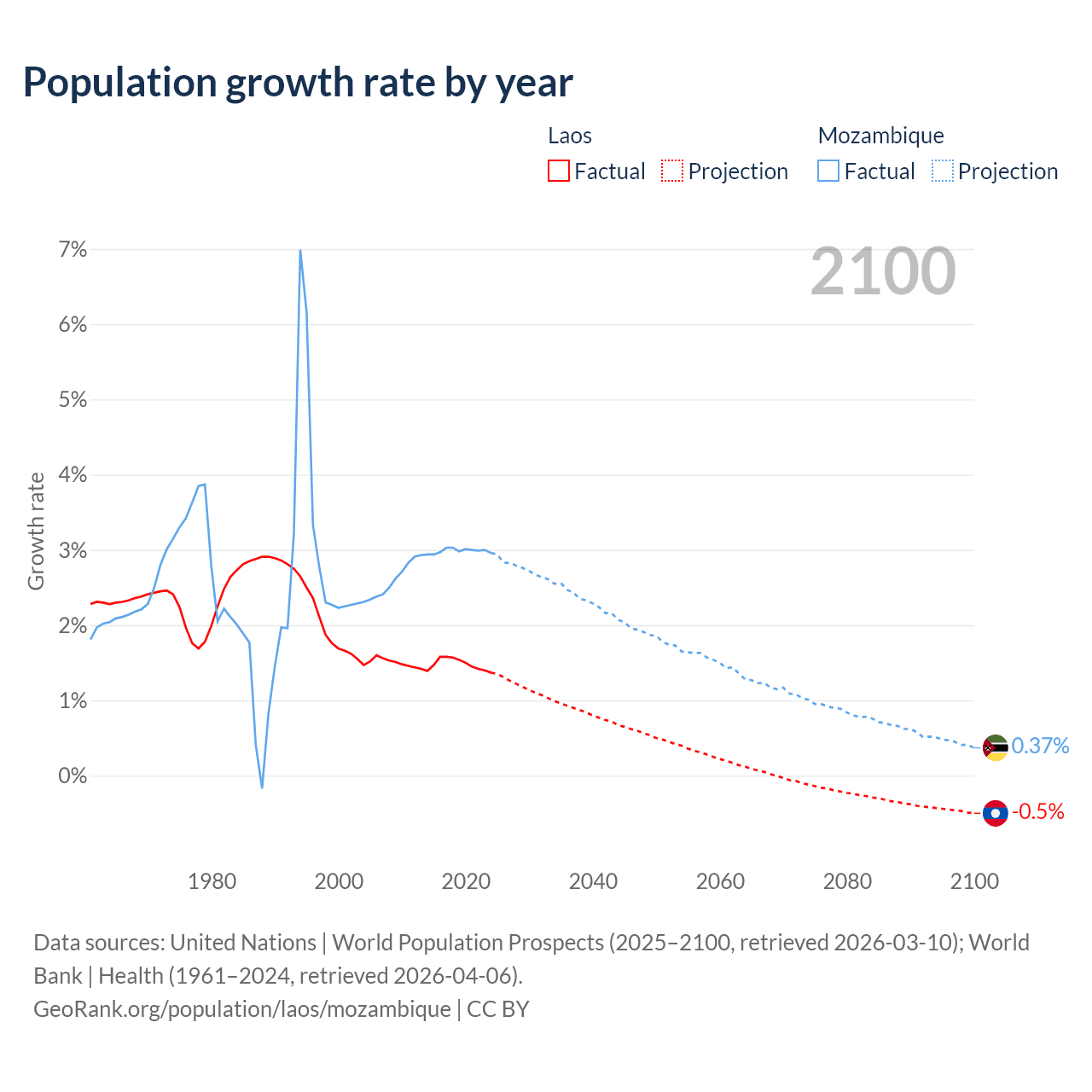 - For the last 10 years, Laos has had an average growth rate of +1.48% per year vs +2.99% in Mozambique.