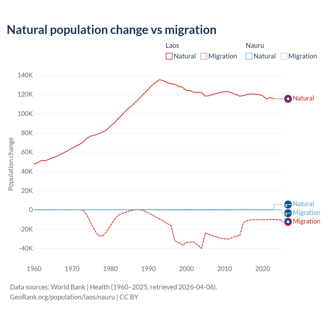 Over the last 10 years, 90.6% of the population change in Laos is from natural causes (a gain of 1,183,013 people) and 9.41% is from migration (a loss of 122,899 people). In Nauru 66.2% is from natural causes (a gain of 2,590 people) and 33.8% is from migration (a loss of 1,320 people).