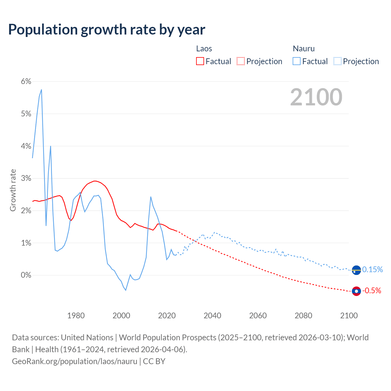 - For the last 10 years, Laos has had an average growth rate of +1.48% per year vs +1.17% in Nauru.