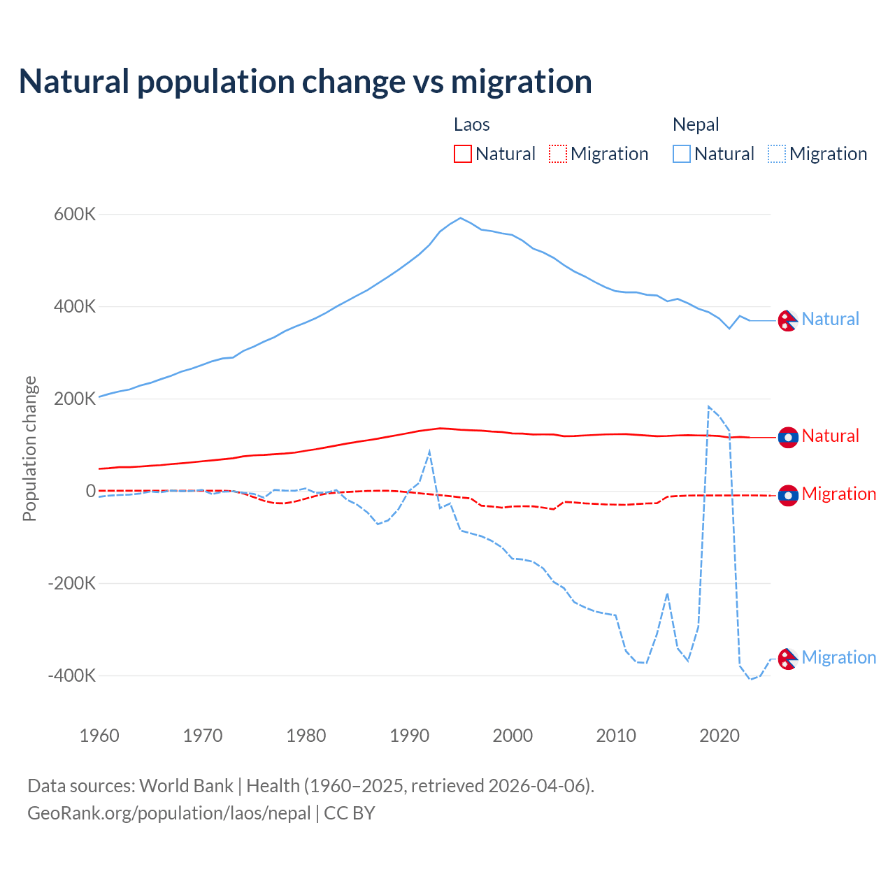 Over the last 10 years, 90.6% of the population change in Laos is from natural causes (a gain of 1,183,013 people) and 9.41% is from migration (a loss of 122,899 people). In Nepal 67.9% is from natural causes (a gain of 3,909,749 people) and 32.1% is from migration (a loss of 1,851,664 people).