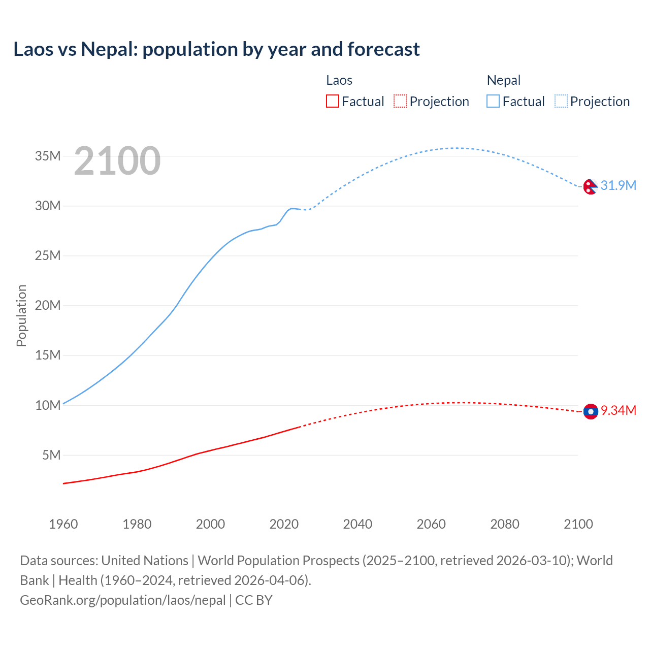 The latest officially reported population of Laos was 7,769,819 in 2024 vs 29,651,054 people in Nepal in 2024. In 2026, based on the adjusted UN estimation, the current Laos' population is 8,004,838 people compared to 29,596,762 in Nepal.