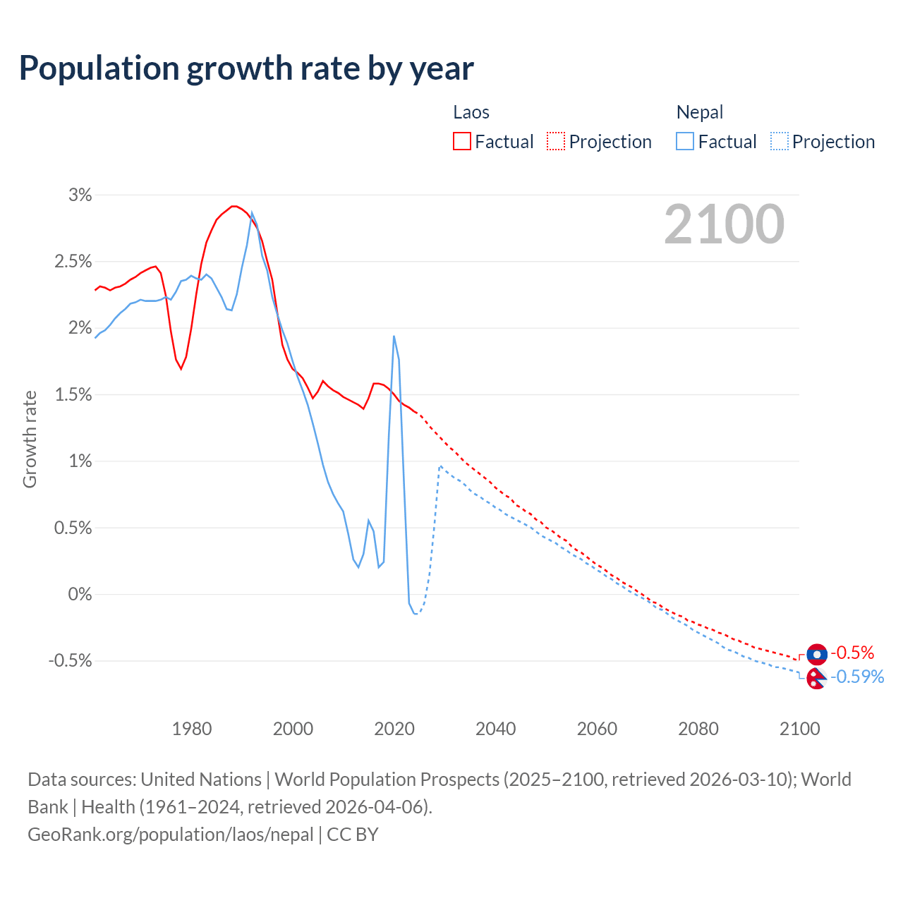 - For the last 10 years, Laos has had an average growth rate of +1.48% per year vs +0.66% in Nepal.