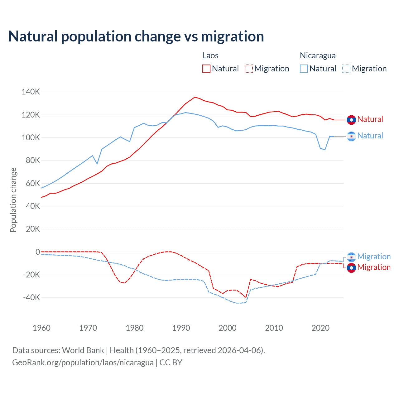 Over the last 10 years, 90.6% of the population change in Laos is from natural causes (a gain of 1,183,013 people) and 9.41% is from migration (a loss of 122,899 people). In Nicaragua 85.5% is from natural causes (a gain of 1,017,084 people) and 14.5% is from migration (a loss of 172,078 people).