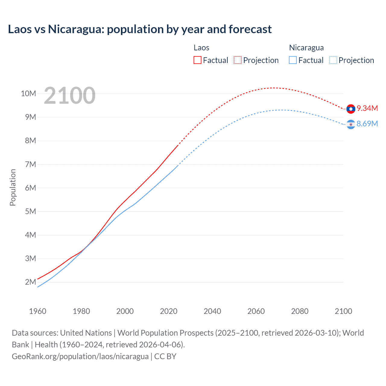 Laos vs Nicaragua: population by year and forecast
