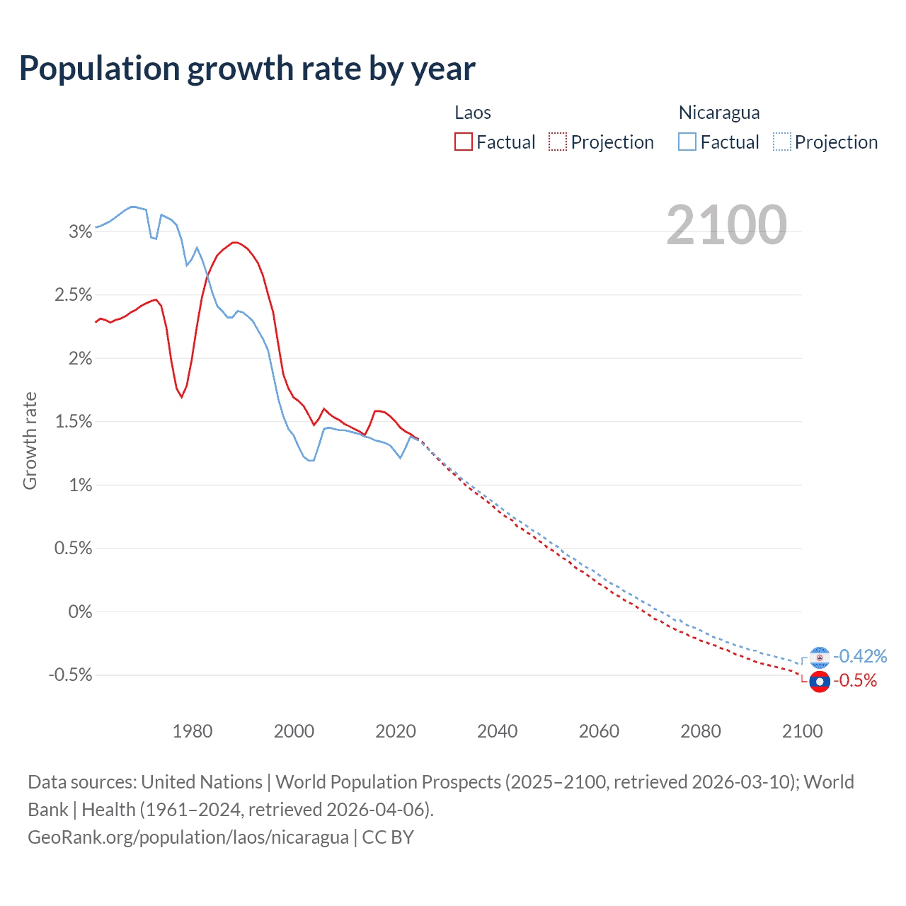 - For the last 10 years, Laos has had an average growth rate of +1.48% per year vs +1.33% in Nicaragua.
