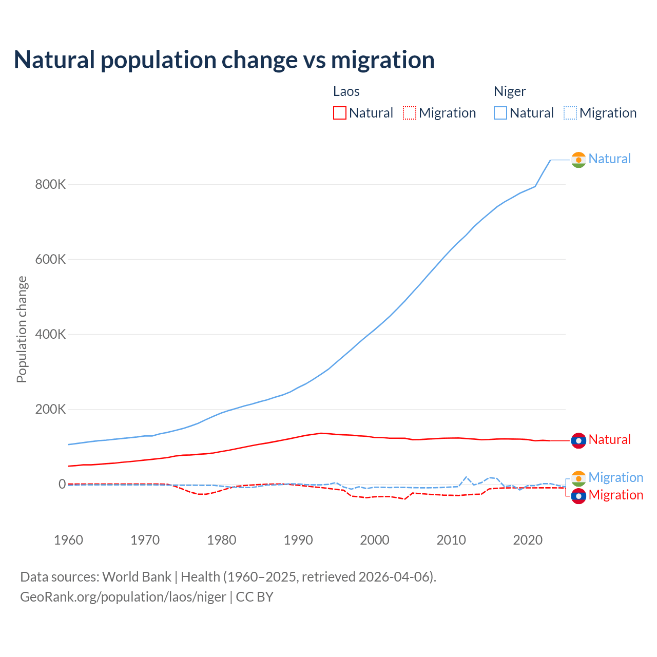 Over the last 10 years, 90.6% of the population change in Laos is from natural causes (a gain of 1,183,013 people) and 9.41% is from migration (a loss of 122,899 people). In Niger 100% is from natural causes (a gain of 7,728,287 people) and 0.03% is from migration (a gain of 2,520 people).