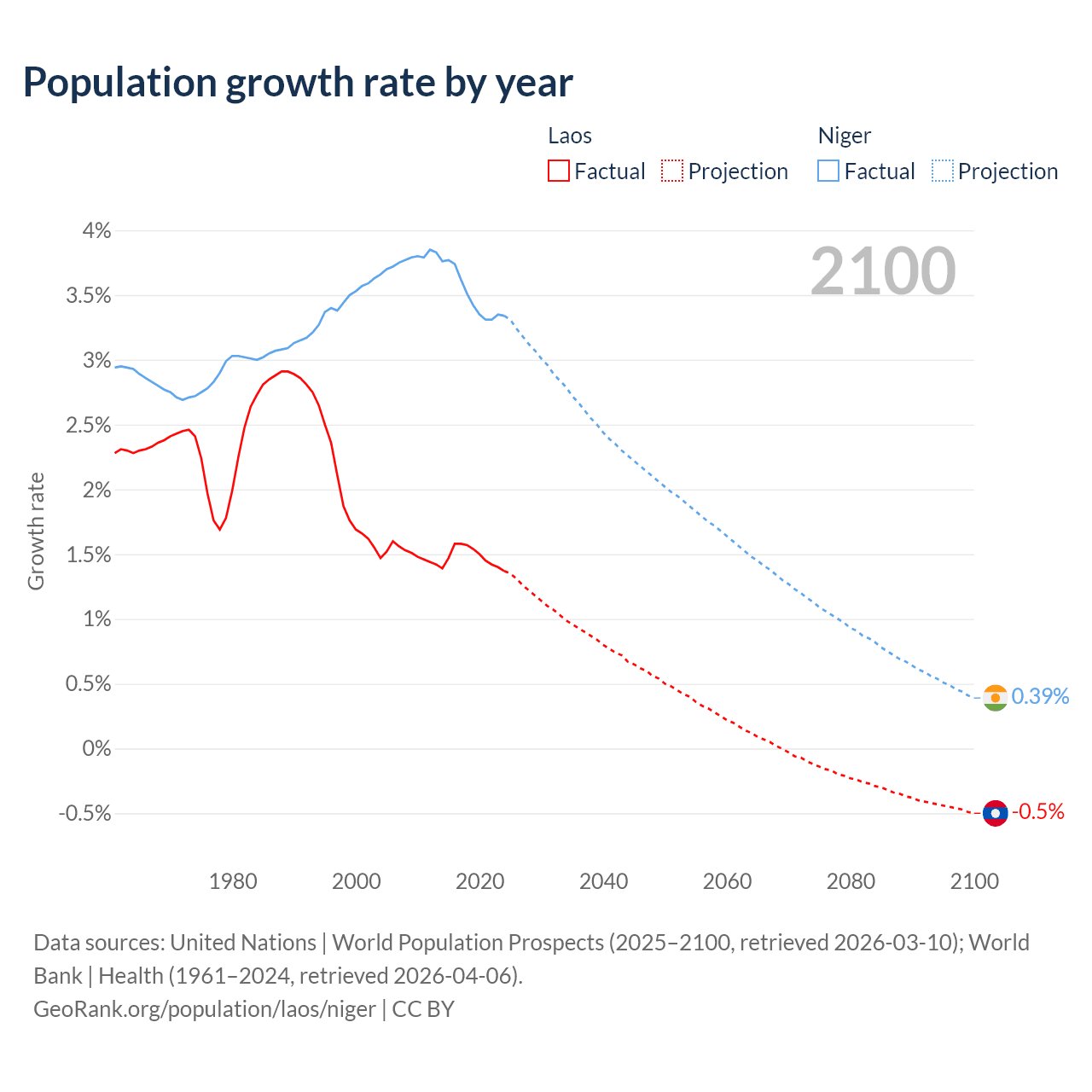 - For the last 10 years, Laos has had an average growth rate of +1.48% per year vs +3.5% in Niger.
