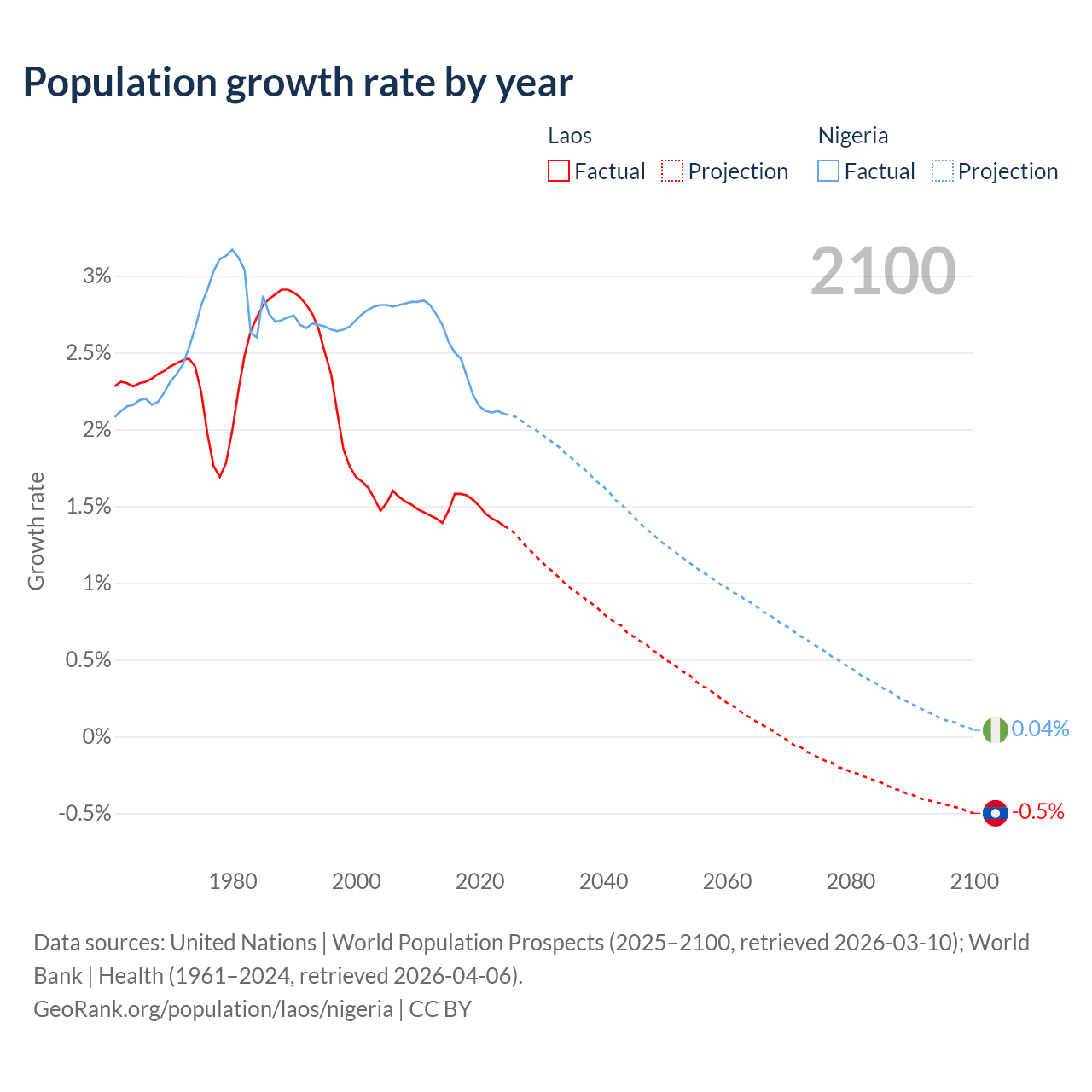 - For the last 10 years, Laos has had an average growth rate of +1.48% per year vs +2.31% in Nigeria.