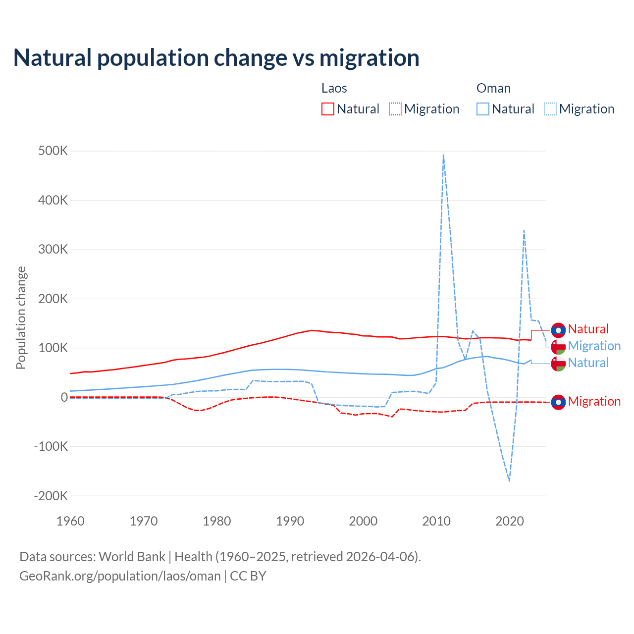 Over the last 10 years, 90.6% of the population change in Laos is from natural causes (a gain of 1,183,013 people) and 9.41% is from migration (a loss of 122,899 people). In Oman 61.6% is from natural causes (a gain of 763,049 people) and 38.4% is from migration (a gain of 475,565 people).