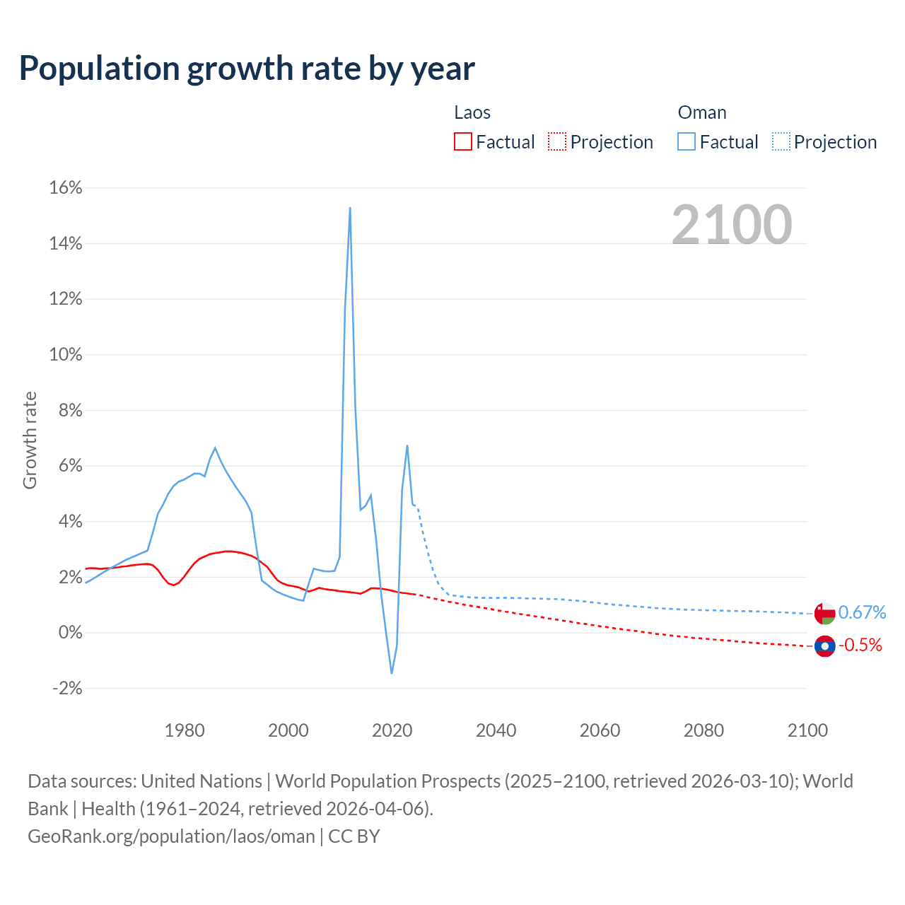 - For the last 10 years, Laos has had an average growth rate of +1.48% per year vs +2.99% in Oman.