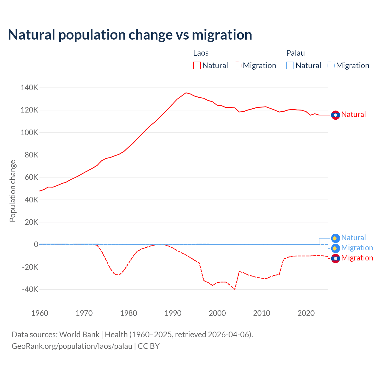 Over the last 10 years, 90.6% of the population change in Laos is from natural causes (a gain of 1,183,013 people) and 9.41% is from migration (a loss of 122,899 people). In Palau 53.8% is from natural causes (a gain of 264 people) and 46.2% is from migration (a loss of 227 people).