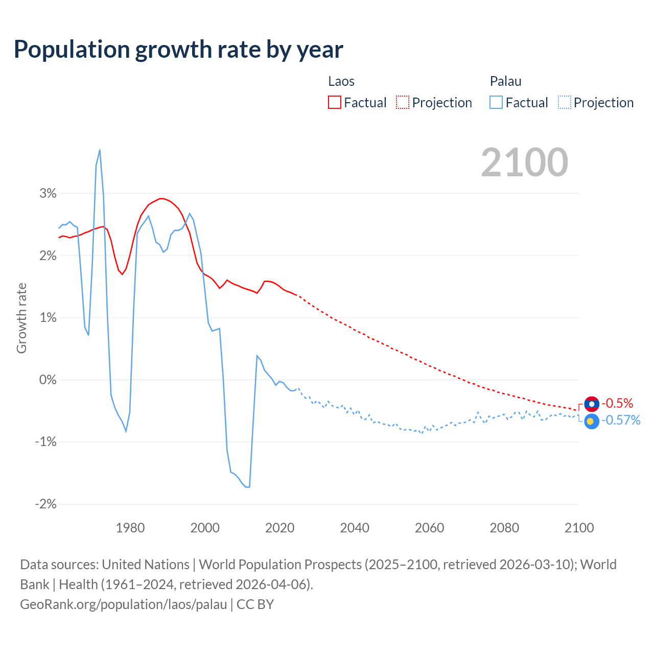 - For the last 10 years, Laos has had an average growth rate of +1.48% per year vs +0.02% in Palau.