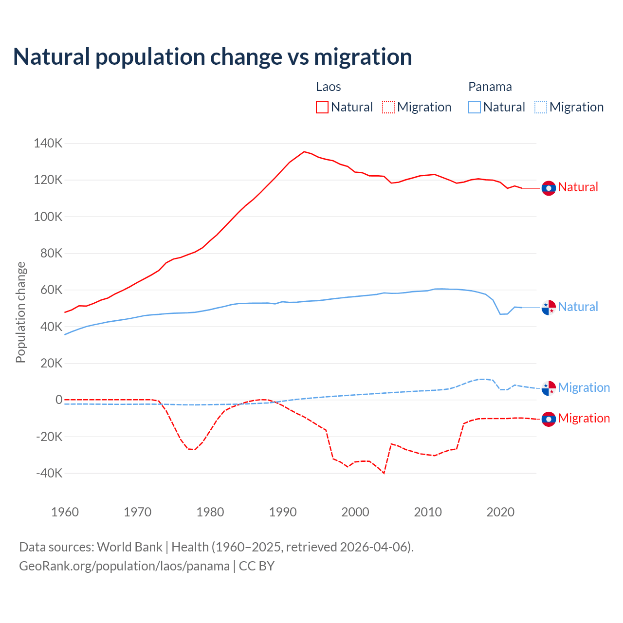 Over the last 10 years, 90.6% of the population change in Laos is from natural causes (a gain of 1,183,013 people) and 9.41% is from migration (a loss of 122,899 people). In Panama 86.5% is from natural causes (a gain of 544,211 people) and 13.5% is from migration (a gain of 84,849 people).