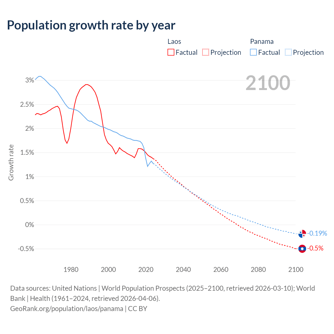 - For the last 10 years, Laos has had an average growth rate of +1.48% per year vs +1.52% in Panama.