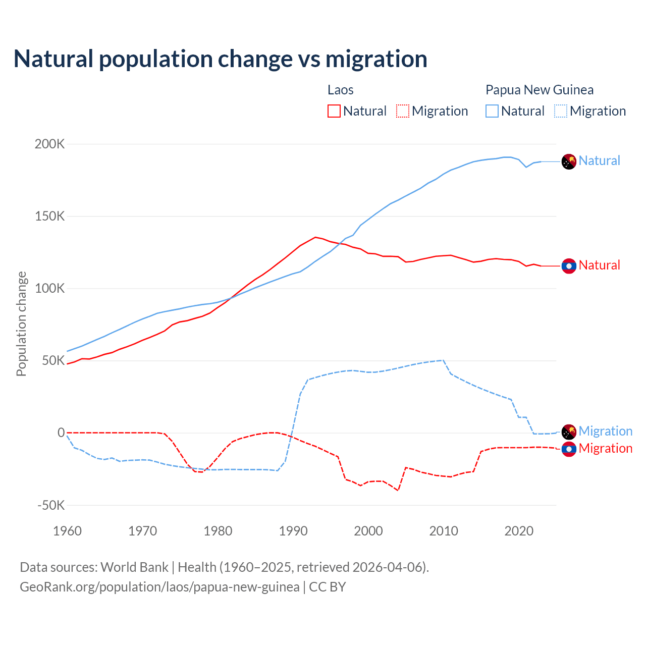 Over the last 10 years, 90.6% of the population change in Laos is from natural causes (a gain of 1,183,013 people) and 9.41% is from migration (a loss of 122,899 people). In Papua New Guinea 91% is from natural causes (a gain of 1,883,906 people) and 8.98% is from migration (a gain of 185,900 people).