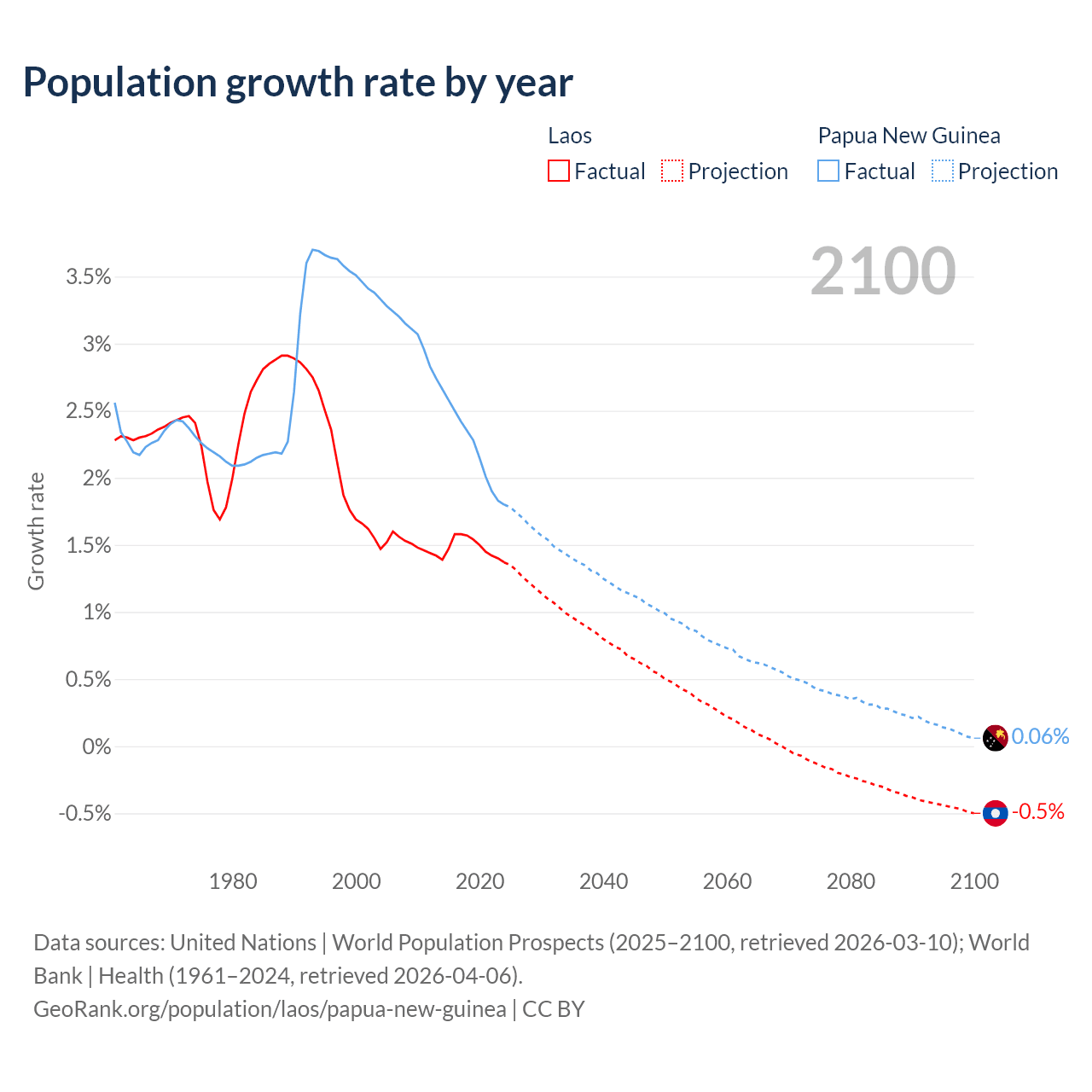 - For the last 10 years, Laos has had an average growth rate of +1.48% per year vs +2.23% in Papua New Guinea.
