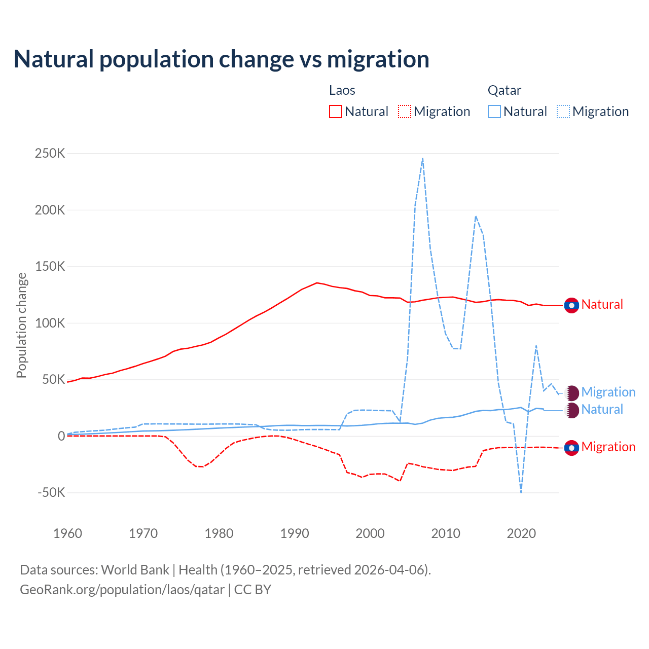 Over the last 10 years, 90.6% of the population change in Laos is from natural causes (a gain of 1,183,013 people) and 9.41% is from migration (a loss of 122,899 people). In Qatar 26.1% is from natural causes (a gain of 232,009 people) and 73.9% is from migration (a gain of 655,712 people).
