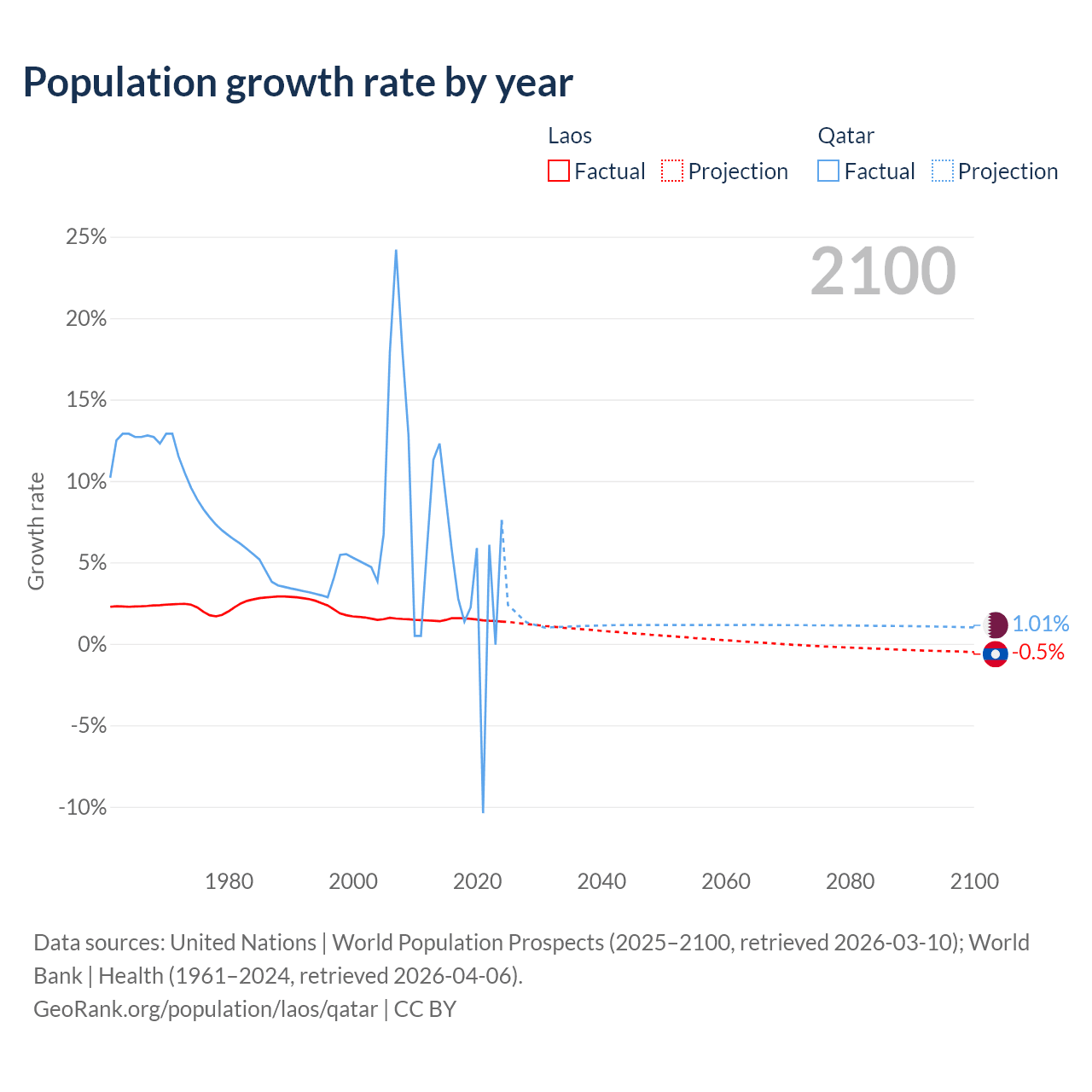 - For the last 10 years, Laos has had an average growth rate of +1.48% per year vs +3.86% in Qatar.