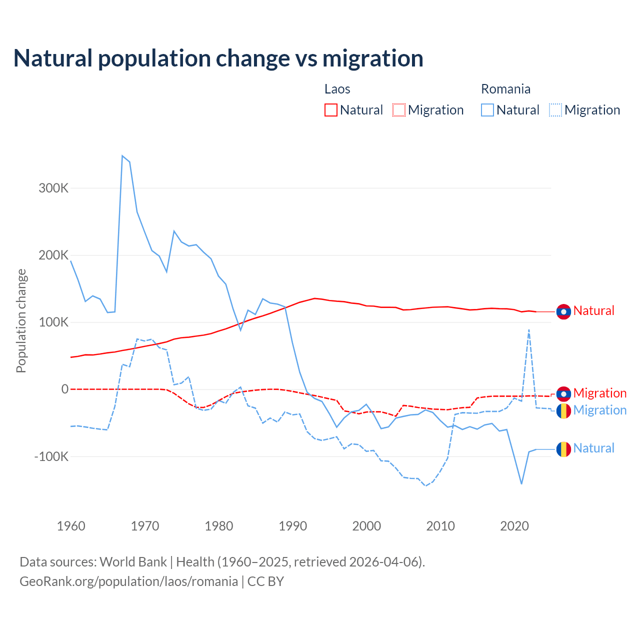 Over the last 10 years, 90.6% of the population change in Laos is from natural causes (a gain of 1,183,013 people) and 9.41% is from migration (a loss of 122,899 people). In Romania 82% is from natural causes (a loss of 766,295 people) and 18% is from migration (a loss of 167,917 people).
